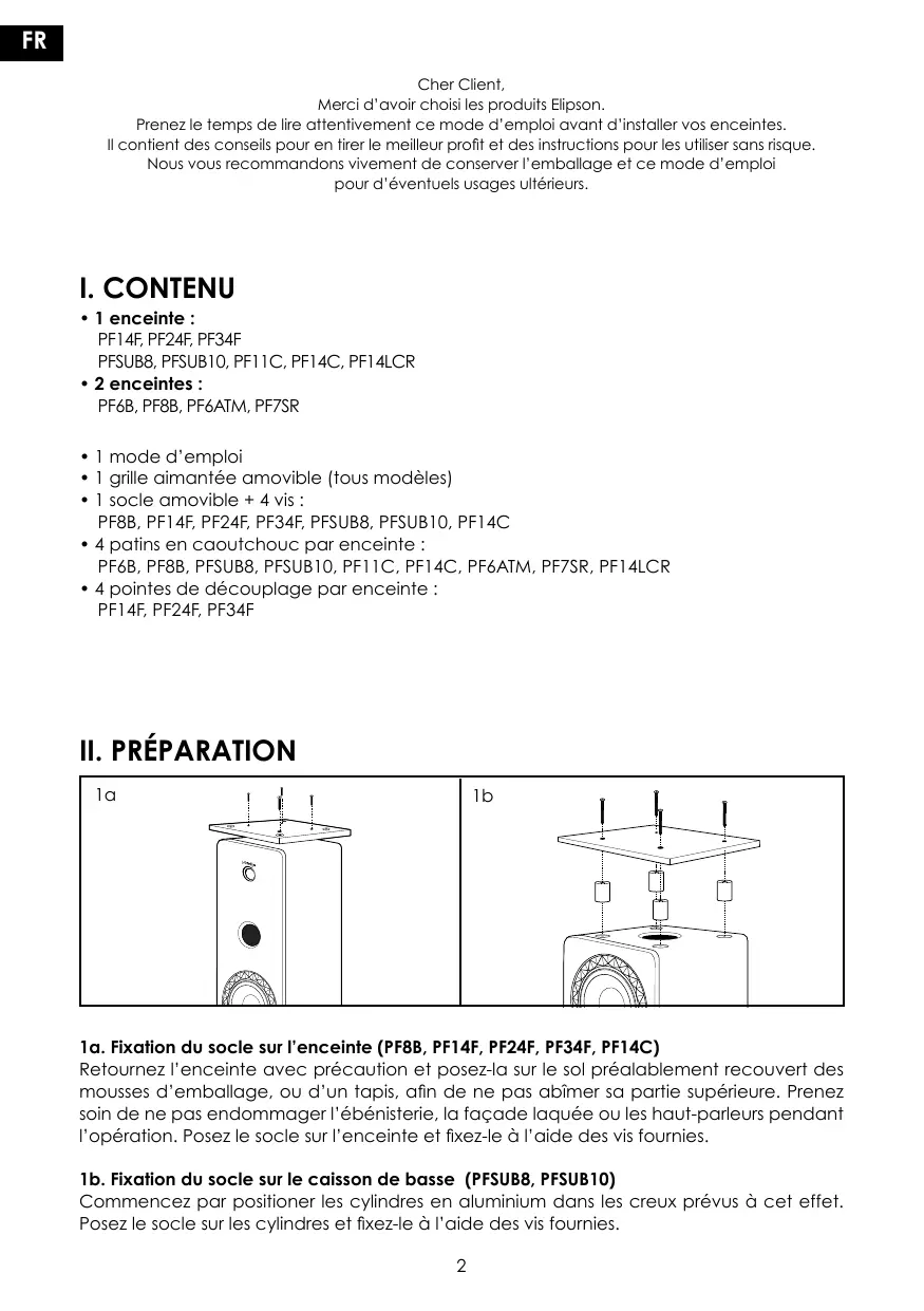 I. CONTENU • 1 enceinte : PF14F, PF24F, PF34F PFSUB8, PFSUB10, PF11C, PF14C, PF14LCR • 2 enceintes : PF6B, PF8B, PF6ATM, PF7SR • 1 mode d’emploi • 1 grille aimantée amovible (tous modèles) • 1 socle amovible + 4 vis : PF8B, PF14F, PF24F, PF34F, PFSUB8, PFSUB10, PF14C • 4 patins en caoutchouc par enceinte : PF6B, PF8B, PFSUB8, PFSUB10, PF11C, PF14C, PF6ATM, PF7SR, PF14LCR • 4 pointes de découplage par enceinte :