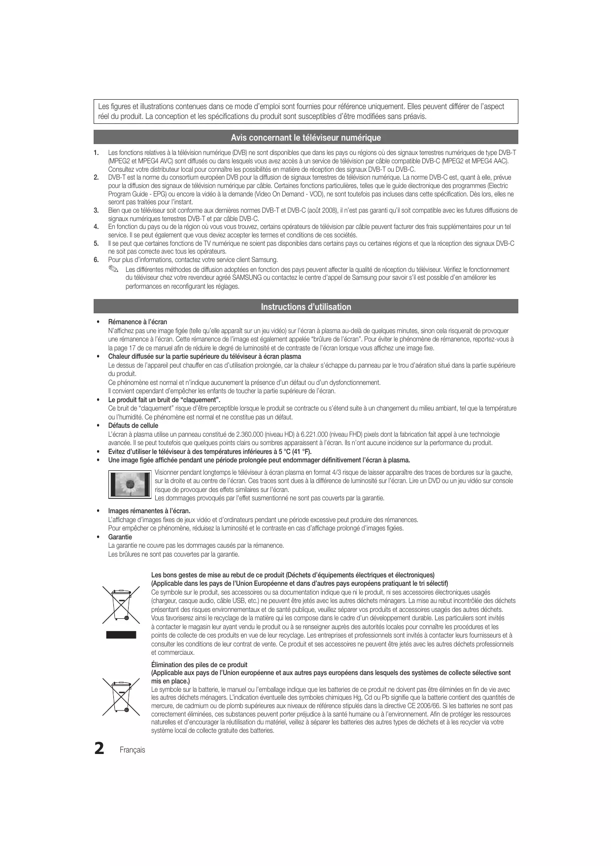 • Chaleur diffusée sur la partie supérieure du téléviseur à écran plasma Le dessus de l’appareil peut chauffer en cas d’utilisation prolongée, car la chaleur s’échappe du panneau par le trou d’aération situé dans la partie supérieure du produit. Ce phénomène est normal et n’indique aucunement la présence d’un défaut ou d’un dysfonctionnement. Il convient cependant d’empêcher les enfants de toucher la partie supérieure de l’écran. Le produit fait un bruit de “claquement”. Ce bruit de “claquement” risque d’être perceptible lorsque le produit se contracte ou s’étend suite à un changement du milieu ambiant, tel que la température ou l’humidité. Ce phénomène est normal et ne constitue pas un défaut. Défauts de cellule L’écran à plasma utilise un panneau constitué de 2.360.000 (niveau HD) à 6.221.000 (niveau FHD) pixels dont la fabrication fait appel à une technologie avancée. Il se peut toutefois que quelques points clairs ou sombres apparaissent à l’écran. Ils n’ont aucune incidence sur la performance du produit. Evitez d’utiliser le téléviseur à des températures inférieures à 5 °C (41 °F). Une image figée affichée pendant une période prolongée peut endommager définitivement l’écran à plasma. Visionner pendant longtemps le téléviseur à écran plasma en format 4/3 risque de laisser apparaître des traces de bordures sur la gauche, sur la droite et au centre de l’écran. Ces traces sont dues à la différence de luminosité sur l’écran. Lire un DVD ou un jeu vidéo sur console risque de provoquer des effets similaires sur l'écran. Les dommages provoqués par l'effet susmentionné ne sont pas couverts par la garantie.