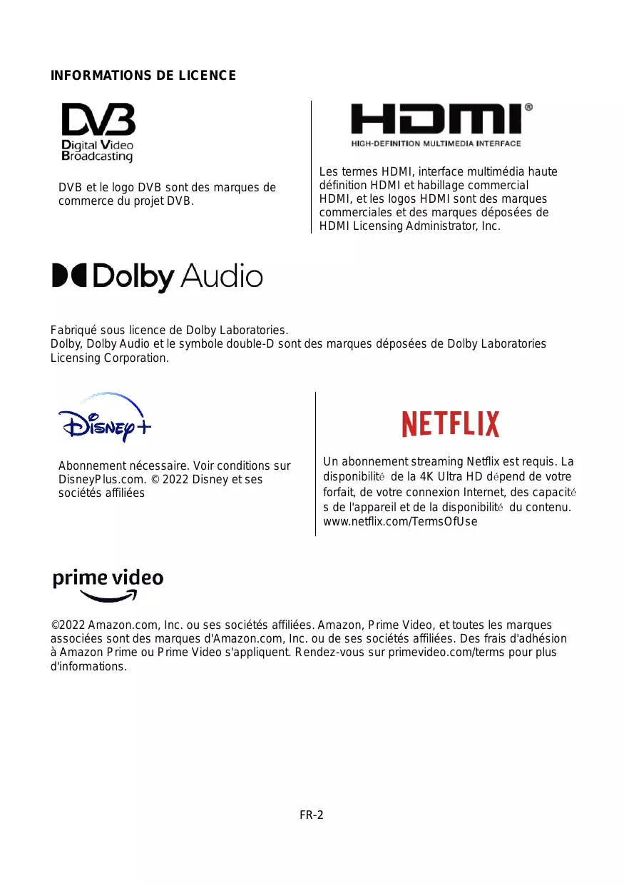 DVB et le logo DVB sont des marques de commerce du projet DVB. Les termes HDMI, interface multimédia haute définition HDMI et habillage commercial HDMI, et les logos HDMI sont des marques commerciales et des marques déposées de HDMI Licensing Administrator, Inc. Fabriqué sous licence de Dolby Laboratories. Dolby, Dolby Audio et le symbole double-D sont des marques déposées de Dolby Laboratories Licensing Corporation. Abonnement nécessaire. Voir conditions sur DisneyPlus.com. © 2022 Disney et ses sociétés affiliées Un abonnement streaming Netflix est requis. La disponibilité de la 4K Ultra HD dépend de votre forfait, de votre connexion Internet, des capacité s de l'appareil et de la disponibilité du contenu. www.netflix.com/TermsOfUse © 2022 Amazon.com, Inc. ou ses sociétés affiliées. Amazon, Prime Video, et toutes les marques associées sont des marques d'Amazon.com, Inc. ou de ses sociétés affiliées. Des frais d'adhésion à Amazon Prime ou Prime Video s'appliquent. Rendez-vous sur primevideo.com/terms pour plus d'informations. FR-2 AVERTISSEMENTS Cet appareil est destiné à un usage domestique uniquement. Toute utilisation autre que celle prévue pour cet appareil, ou pour une autre application que celle prévue, par exemple une application commerciale, est interdite. Aération Prévoyez un espace libre d'au moins 10 cm tout autour du produit. Il convient que l’aération ne soit pas gênee par l’obstruction des ouvertures d’aération par des objets tels que journaux, nappes, rideaux, etc. Il convient de ne pas placer sur l’appareil de sources de flammes nues, telles que des bougies allumées. Disposez le cordon d’alimentation de manière à ce qu'il ne puisse être ni piétiné ni pincé, notamment au niveau de sa fiche, de la prise de courant et de l’endroit d’où il sort de l'appareil. Cet appareil n'est pas destine à être utilisé sous un climat tropical. L’appareil ne doit pas être exposé á des égouttements d'eau ou des éclaboussures et de plus qu'aucun objet rempli de liquide tel que des vases ne doit être placé sur l’ appareil. Déposez vos piles usagées auprès d'installation de recyclage pour protéger notre environnement. Les piles (piles installées) ne doivent pas être exposées à une chaleur excessive telle que celle du soleil, d'un feu ou d'origine similaire. ATTENTION Danger d'explosion si la pile n’est pas remplacée correctement. Ne remplacer que par le même type ou un type équivalent. La fiche SECTEUR est utilisée comme dispositif de déconnexion ; le dispositif de déconnexion doit rester facilement accessible. Mise au rebut d’une batterie dans un feu ou dans un four chaud, ou écrasement mécanique ou coupure d’une batterie ou être exposées à une chaleur excessive telle que celle du soleil, d'un feu ou d'origine similaire, susceptible de provoquer une explosion. Maintien d’une batterie dans un environnement à très haute température pouvant provoquer une explosion ou la fuite de liquide ou de gaz inflammables. La batterie soumise à une pression de l’air extrêmement faible pouvant provoquer une explosion ou la fuite de liquide ou de gaz inflammables. Différents types de pile ne doivent pas être mélangées. Des piles neuves ne doivent pas être mélangées à des piles usagées. Les piles doivent être installées en respectant la polarité +/-. Les piles usagées doivent être enlevées de l'appareil. Ne pas court-circuiter les piles. FR-3