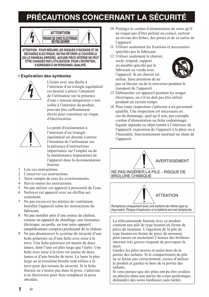 Le point d’exclamation à l’intérieur d’un triangle équilatéral est destiné à attirer l’attention de l’utilisateur sur la présence d’instructions importantes sur l’emploi ou de la maintenance (réparation) de l’appareil dans la documentation fournie. Lire ces instructions. Conserver ces instructions. Tenir compte de tous les avertissements. Suivre toutes les instructions. Ne pas utiliser cet appareil à proximité de l’eau. Nettoyer cet appareil avec un chiffon sec seulement. Ne pas recouvrir les ailettes de ventilation. Installer l’appareil selon les instructions du fabricant. Ne pas installer près d’une source de chaleur, comme un appareil de chauffage, une résistance électrique, un poêle, ou tout autre appareil (amplificateurs compris) produisant de la chaleur. Ne pas désamorcer le système de sécurité d’une fiche polarisée ou d’une fiche avec mise à la terre. Une fiche polarisée est munie de deux lames, dont l’une est plus large que l’autre. Une fiche avec mise à la terre est munie de deux lames et d’une broche de terre. La lame la plus large ou la troisième broche sont reliées à la terre pour des raisons de sécurité. Si la fiche fournie ne s’insère pas dans la prise, s’adresser à un électricien pour faire remplacer la prise obsolète. Fr