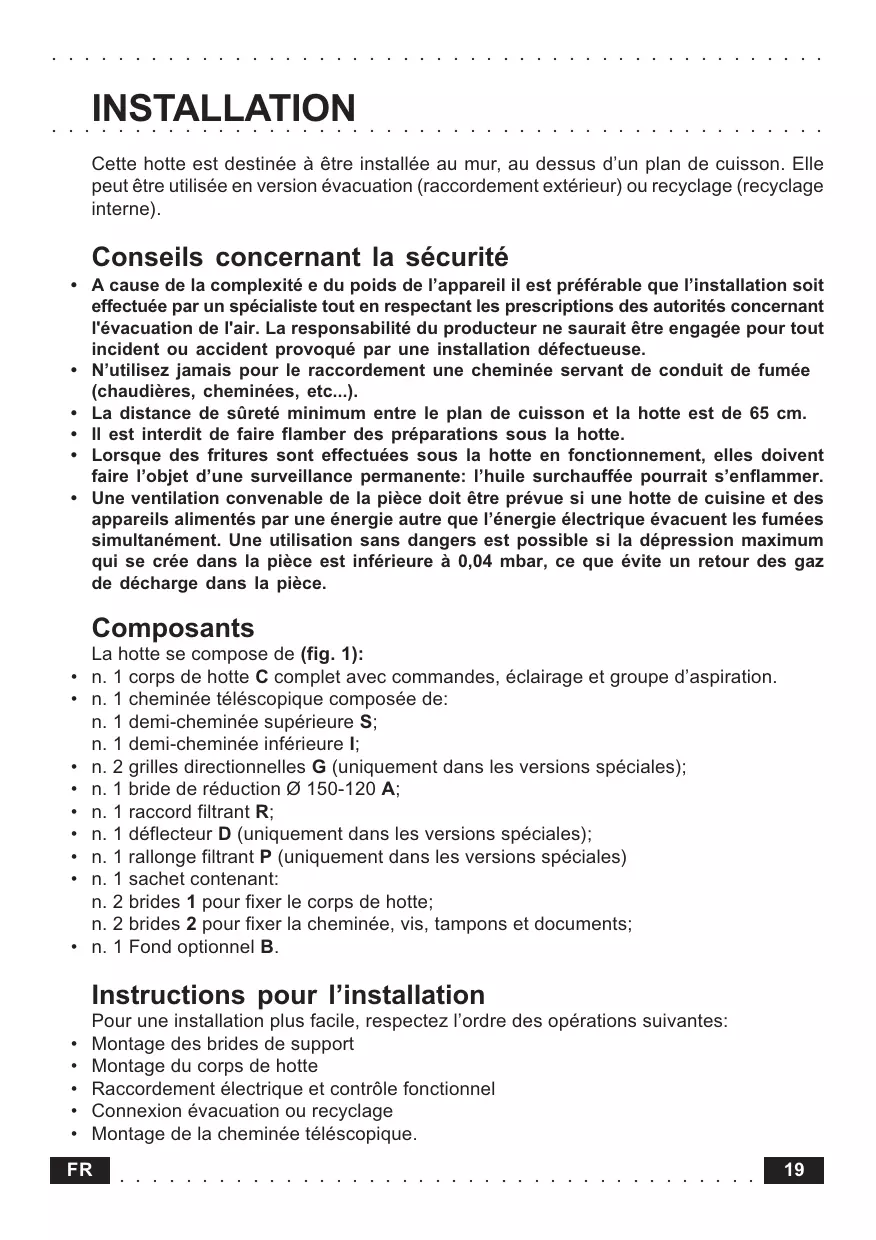 INSTALLATION 19 Conseils concernant la sécurité 19 Composants 19 Instructions pour l’installation 19 Montage des brides de support. 20 Montage du corps de hotte (fig. 3). 20 Raccordement électrique et contrôle fonctionnel. 21 Connexion évacuation ou recyclage 21 Montage de la cheminée téléscopique (fig.8) 21