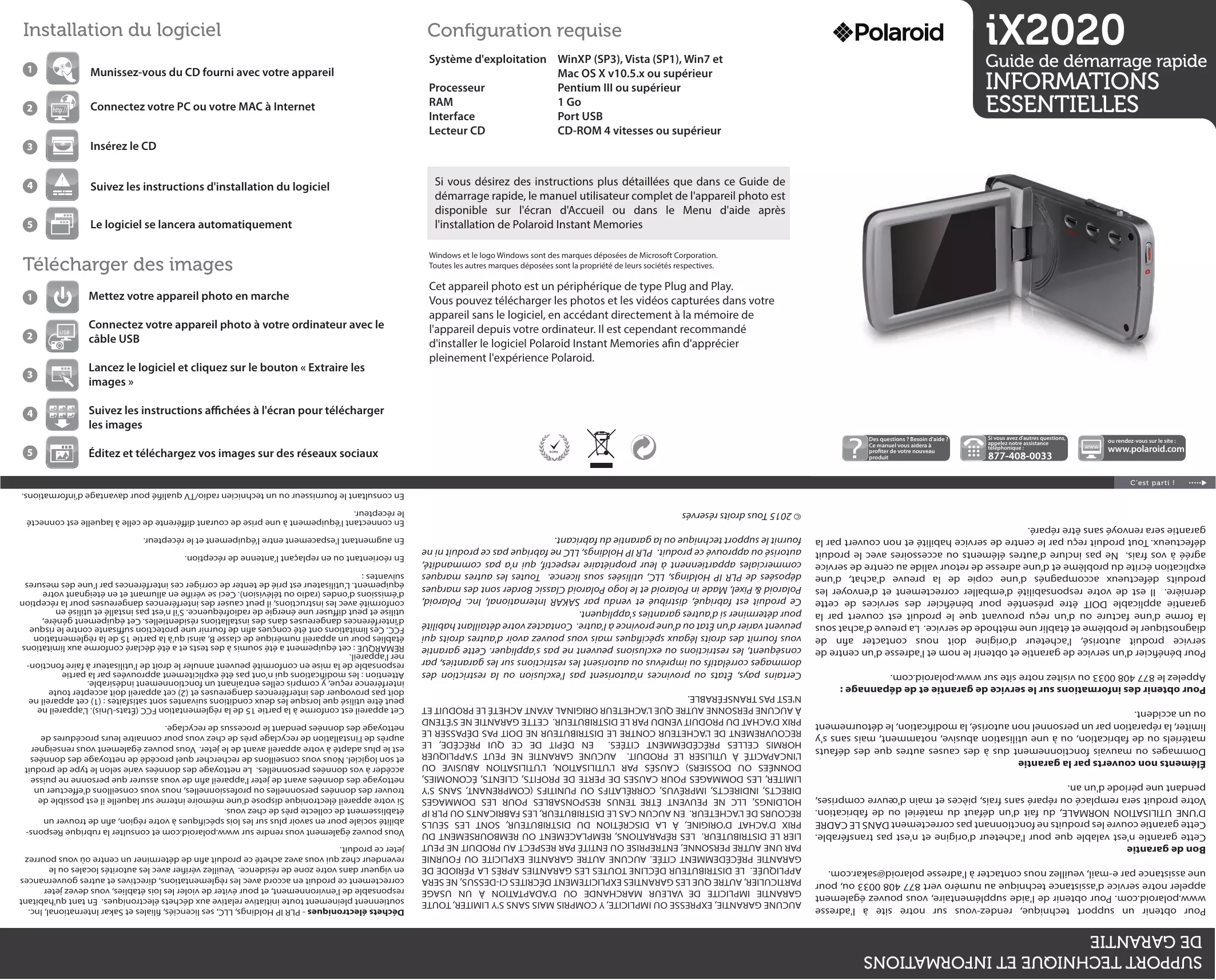 SUPPORT TECHNIQUE ET INFORMATIONS DE GARANTIE Pour obtenir un support technique, rendez-vous sur notre site à l'adresse www.polaroid.com. Pour obtenir de l'aide supplémentaire, vous pouvez également appeler notre service d'assistance technique au numéro vert 877 408 0033 ou, pour une assistance par e-mail, veuillez nous contacter à l'adresse polaroid@sakar.com. Bon de garantie Cette garantie n'est valable que pour l'acheteur d'origine et n'est pas transférable. Cette garantie couvre les produits ne fonctionnant pas correctement DANS LE CADRE D'UNE UTILISATION NORMALE, du fait d'un défaut du matériel ou de fabrication. Votre produit sera remplacé ou réparé sans frais, pièces et main d'œuvre comprises, pendant une période d'un an. Éléments non couverts par la garantie Dommages ou mauvais fonctionnement dus à des causes autres que des défauts matériels ou de fabrication, ou à une utilisation abusive, notamment, mais sans s'y limiter, la réparation par un personnel non autorisé, la modification, le détournement ou un accident. Pour obtenir des informations sur le service de garantie et de dépannage : Appelez le 877 408 0033 ou visitez notre site sur www.polaroid.com. Pour bénéficier d'un service de garantie et obtenir le nom et l'adresse d'un centre de service produit autorisé, l'acheteur d'origine doit nous contacter afin de diagnostiquer le problème et établir une méthode de service. La preuve d'achat sous la forme d'une facture ou d'un reçu prouvant que le produit est couvert par la garantie applicable DOIT être présentée pour bénéficier des services de cette dernière. Il est de votre responsabilité d'emballer correctement et d'envoyer les produits défectueux accompagnés d'une copie de la preuve d'achat, d'une explication écrite du problème et d'une adresse de retour valide au centre de service agréé à vos frais. Ne pas inclure d'autres éléments ou accessoires avec le produit défectueux. Tout produit reçu par le centre de service habilité et non couvert par la garantie sera renvoyé sans être réparé.