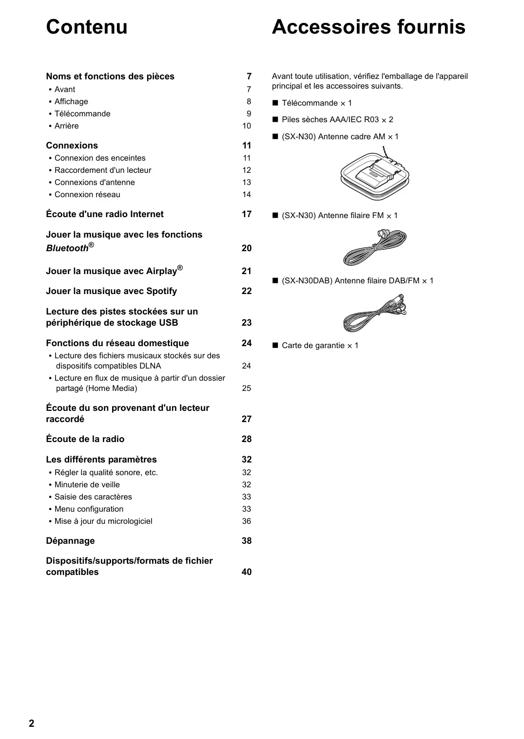 Es 0 Plusieurs des plus importantes radios internet comme TuneIn Radio sont déjà enregistrées dans le menu 0 Prend en charge la fonction AirPlay®. Vous pouvez lire à distance des fichiers musicaux stockés sur un iPhone®, un iPod touch®, ou un iPad® 0 Prend en charge le service Spotify. Lisez la musique de Spotify avec un son de haute qualité 0 Fonctionnalité réseau domestique vous permettant de lire des fichiers musicaux à partir de votre ordinateur (DLNA, Home Media)
