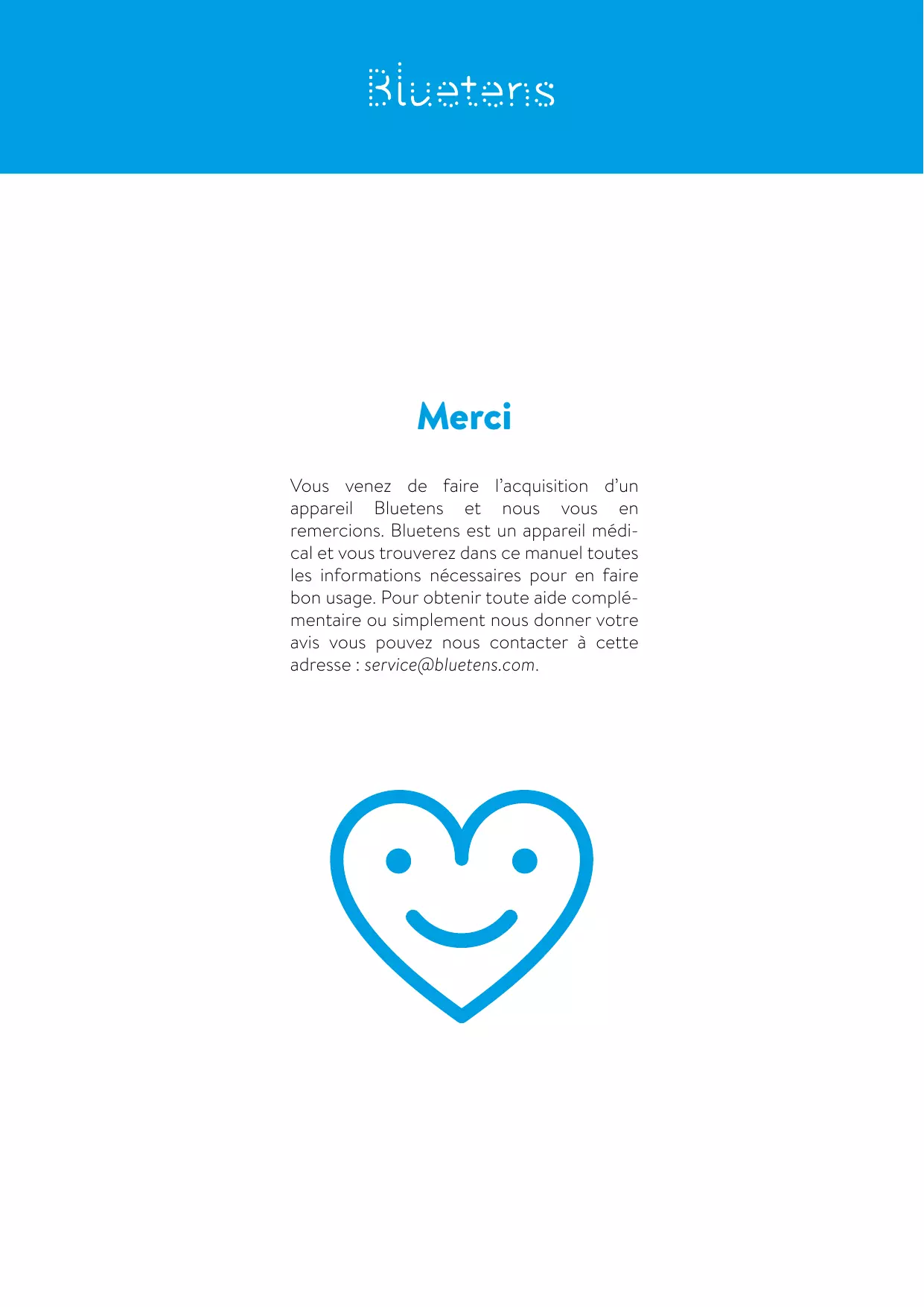 Merci Vous venez de faire l’acquisition d’un appareil Bluetens et nous vous en remercions. Bluetens est un appareil médical et vous trouverez dans ce manuel toutes les informations nécessaires pour en faire bon usage. Pour obtenir toute aide complémentaire ou simplement nous donner votre avis vous pouvez nous contacter à cette adresse : service@bluetens.com. Sommaire Qu’est-ce que Bluetens ?