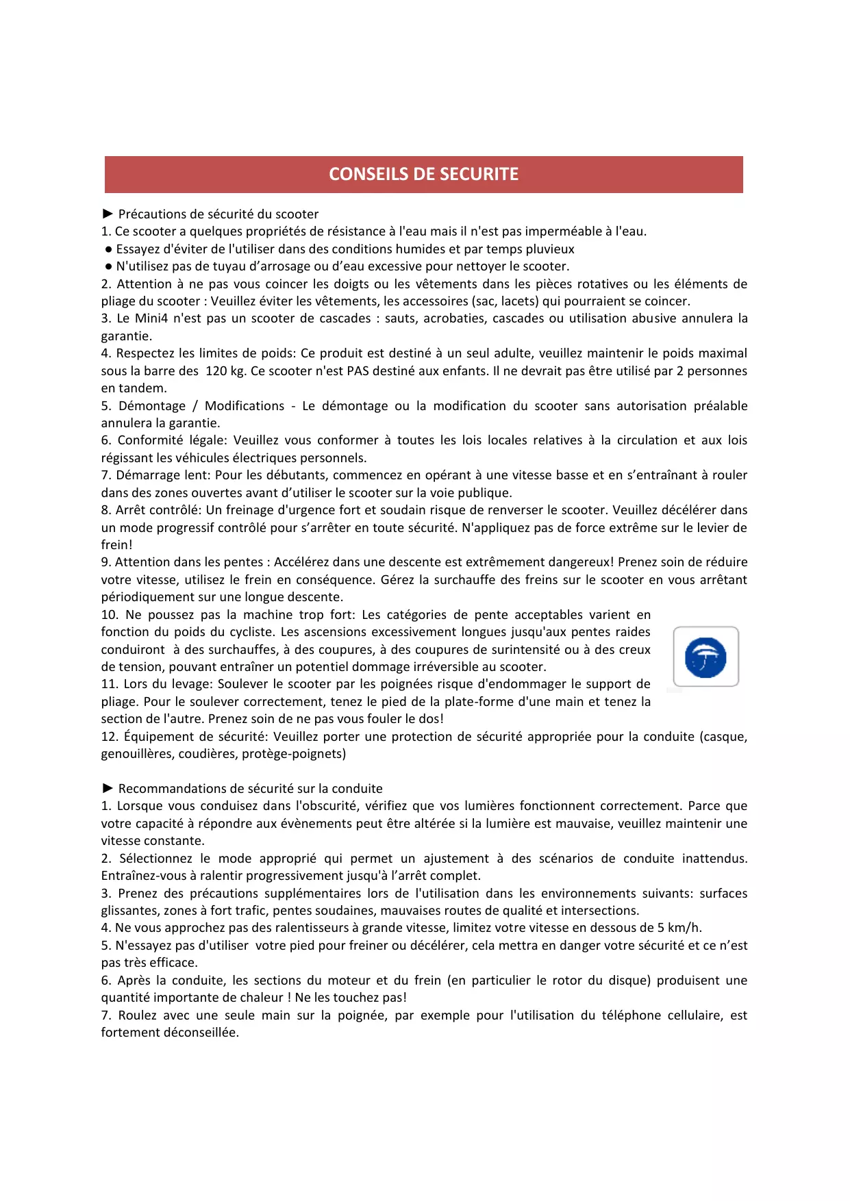 - Le Mini4 n'est pas un scooter de cascades : sauts, acrobaties, cascades ou utilisation abusive annulera la garantie.