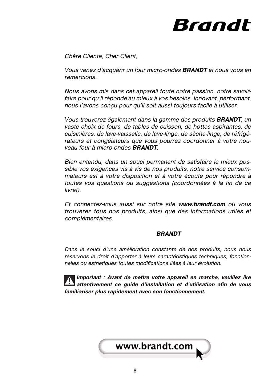 Chère Cliente, Cher Client, Vous venez d’acquérir un four micro-ondes BRANDT et nous vous en remercions. Nous avons mis dans cet appareil toute notre passion, notre savoirfaire pour qu’il réponde au mieux à vos besoins. Innovant, performant, nous l’avons conçu pour qu’il soit aussi toujours facile à utiliser. Vous trouverez également dans la gamme des produits BRANDT, un vaste choix de fours, de tables de cuisson, de hottes aspirantes, de cuisinières, de lave-vaisselle, de lave-linge, de sèche-linge, de réfrigérateurs et congélateurs que vous pourrez coordonner à votre nouveau four à micro-ondes BRANDT. Bien entendu, dans un souci permanent de satisfaire le mieux possible vos exigences vis à vis de nos produits, notre service consommateurs est à votre disposition et à votre écoute pour répondre à toutes vos questions ou suggestions (coordonnées à la fin de ce livret). Et connectez-vous aussi sur notre site www.brandt.com où vous trouverez tous nos produits, ainsi que des informations utiles et complémentaires. BRANDT Dans le souci d’une amélioration constante de nos produits, nous nous réservons le droit d’apporter à leurs caractéristiques techniques, fonctionnelles ou esthétiques toutes modifications liées à leur évolution. Important : Avant de mettre votre appareil en marche, veuillez lire attentivement ce guide d’installation et d’utilisation afin de vous familiariser plus rapidement avec son fonctionnement.