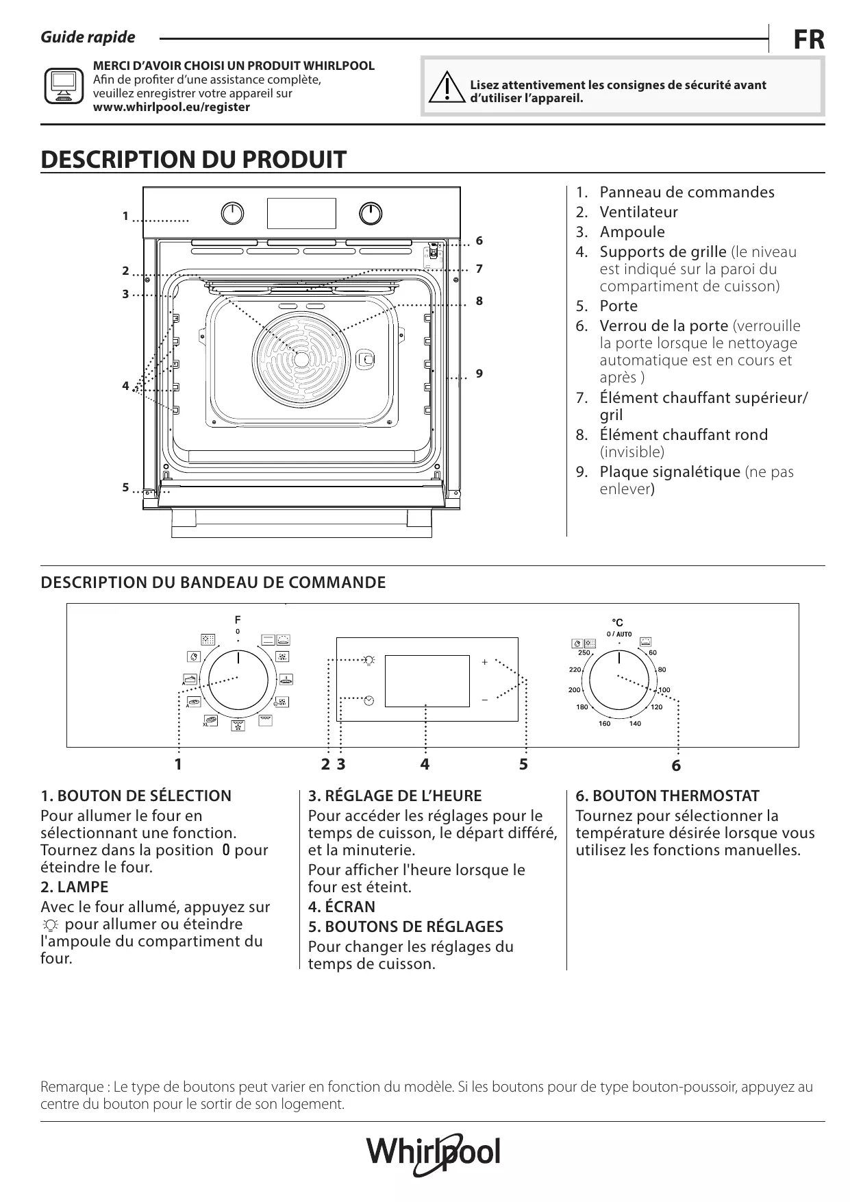 FR Guide rapide MERCI D’AVOIR CHOISI UN PRODUIT WHIRLPOOL Afin de profiter d’une assistance complète, veuillez enregistrer votre appareil sur www.whirlpool.eu/register