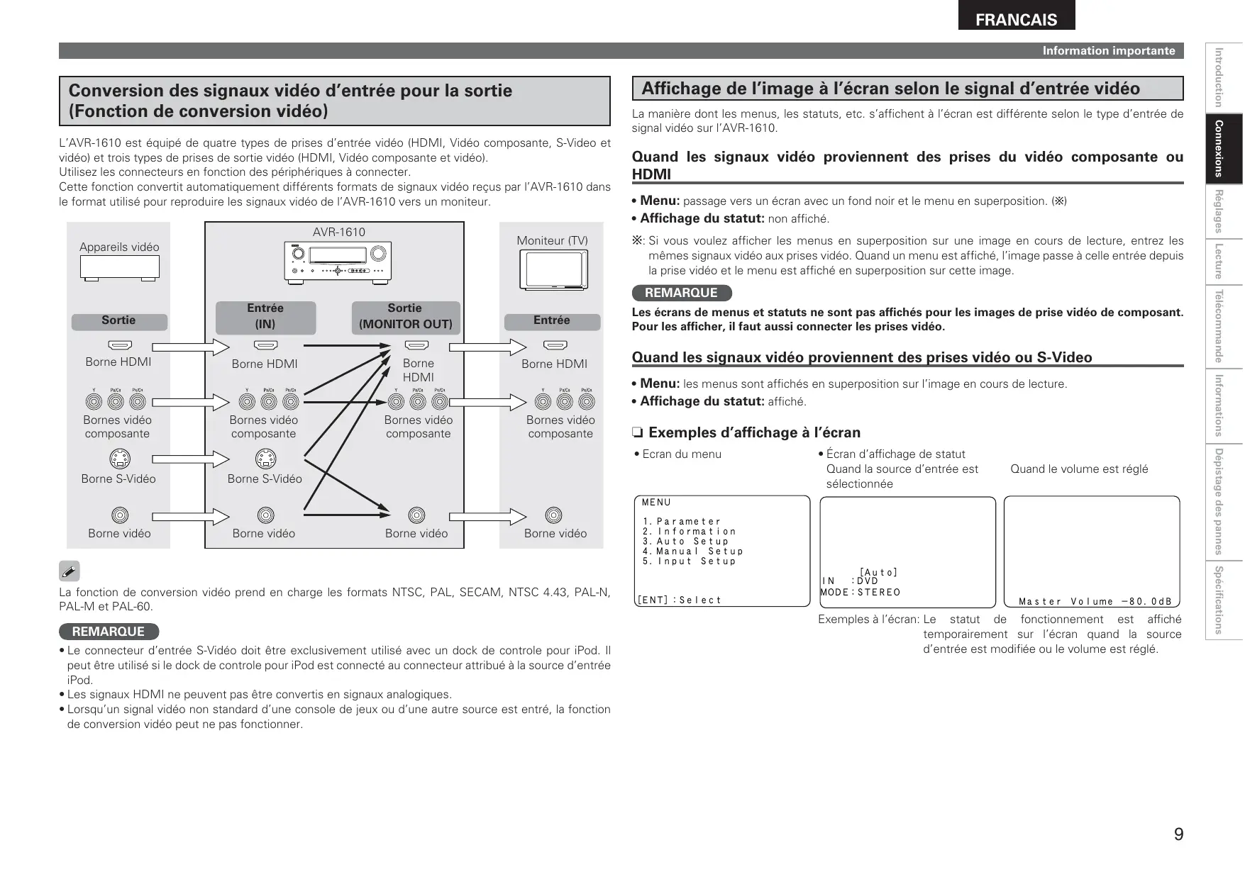 | L'affichage à l'écran n'apparait pas. | • "OFF" s'affiche comme statut.• L'affichage du menu principal est "OFF.• L'affichage pendant le fonctionnement du tuner est "OFF.• L'affichage pendant le fonctionnement de l'iPod est "OFF. | • Quand les signaux HDMI ou des composants video via l'AVR-1610 sont présents, l'affichage est activé en appuyant sur le touche MENU de l'appareil ou sur le touche MENU de la télécommande.• Réglez "Manual Setup" - "Option Setup" - "On-Screen Display" - "Text" sur "ON."• Réglez "Manual Setup" - "Option Setup" - "On-Screen Display" - "Master Volume" sur "Top" ou "Bottom."• À régler quand "Manual Setup" - "On-Screen Display" - "Tuner Information" n'est pas sur "OFF."• À régler quand "Manual Setup" - "On-Screen Display" - "iPod Information" n'est pas sur "OFF." | 928282929 |