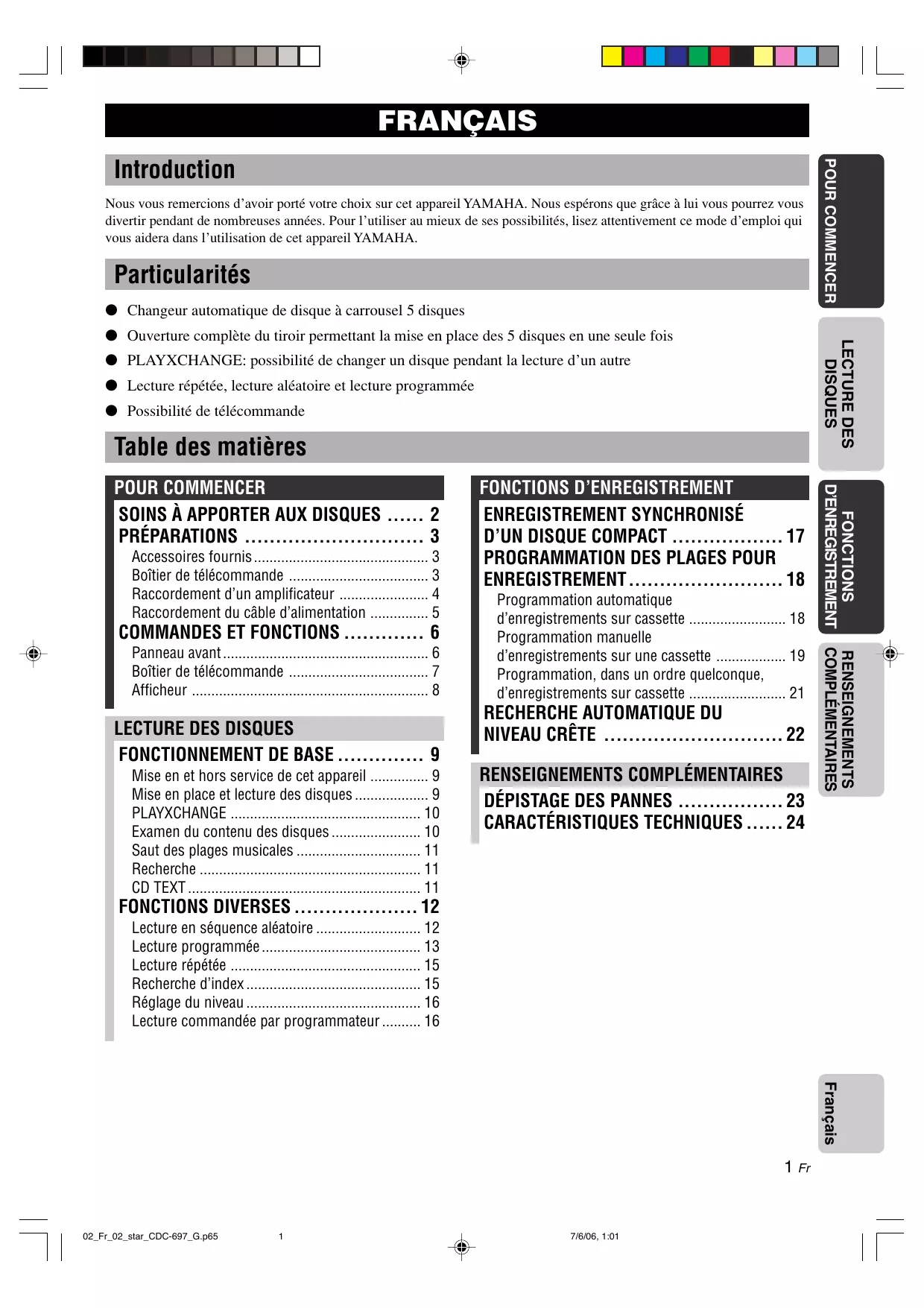 • GEBRUIKSAANWIJZING Getting Started FRANÇAIS Nous vous remercions d’avoir porté votre choix sur cet appareil YAMAHA. Nous espérons que grâce à lui vous pourrez vous divertir pendant de nombreuses années. Pour l’utiliser au mieux de ses possibilités, lisez attentivement ce mode d’emploi qui vous aidera dans l’utilisation de cet appareil YAMAHA. Particularités ● Changeur automatique de disque à carrousel 5 disques LECTURE DES DISQUES ● Ouverture complète du tiroir permettant la mise en place des 5 disques en une seule fois ● PLAYXCHANGE: possibilité de changer un disque pendant la lecture d’un autre ● Lecture répétée, lecture aléatoire et lecture programmée ● Possibilité de télécommande Table des matières Accessoires fournis p. 3