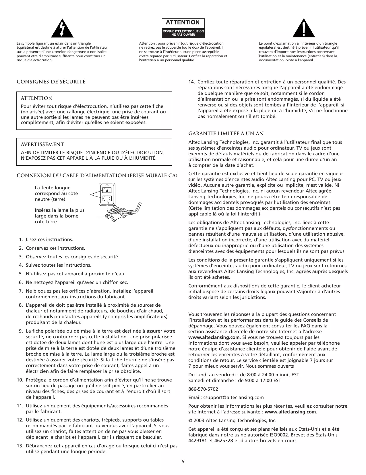réparations sont nécessaires lorsque l’appareil a été endommagé de quelque manière que ce soit, notamment si le cordon d’alimentation ou la prise sont endommagés, si du liquide a été renversé ou si des objets sont tombés à l’intérieur de l’appareil, si l’appareil a été exposé à la pluie ou à l’humidité, s’il ne fonctionne pas normalement ou s’il est tombé. ATTENTION Pour éviter tout risque d’électrocution, n’utilisez pas cette fiche (polarisée) avec une rallonge électrique, une prise de courant ou une autre sortie si les lames ne peuvent pas être insérées complètement, afin d’éviter qu’elles ne soient exposées. Garantie limitée à un an Altec Lansing Technologies, Inc. garantit à l’utilisateur final que tous ses systèmes d’enceintes audio pour ordinateur, TV ou jeux sont exempts de défauts matériels ou de fabrication dans le cadre d’une utilisation normale et raisonnable, et cela pour une durée d’un an à compter de la date d’achat. AVERTISSEMENT AFIN DE LIMITER LE RISQUE D’INCENDIE OU D’ÉLECTROCUTION, N’EXPOSEZ PAS CET APPAREIL À LA PLUIE OU À L’HUMIDITÉ. Cette garantie est exclusive et tient lieu de seule garantie en vigueur sur les systèmes d’enceintes audio Altec Lansing pour PC, TV ou jeux vidéo. Aucune autre garantie, explicite ou implicite, n’est valide. Ni Altec Lansing Technologies, Inc. ni aucun revendeur Altec agréé Lansing Technologies, Inc. ne pourra être tenu responsable de dommages accidentels provoqués par l’utilisation des enceintes. (Cette limitation des dommages accidentels ou consécutifs n’est pas applicable là où la loi l’interdit.) Connexion du câble d’alimentation (prise murale CA) La fente longue correspond au côté neutre (terre). Insérez la lame la plus large dans la borne côté terre. Les obligations de Altec Lansing Technologies, Inc. liées à cette garantie ne s’appliquent pas aux défauts, dysfonctionnements ou pannes résultant d’une mauvaise utilisation, d’une utilisation abusive, d’une installation incorrecte, d’une utilisation avec du matériel défectueux ou inapproprié ou d’une utilisation des systèmes d’enceintes avec des équipements pour lesquels ils ne sont pas prévus.