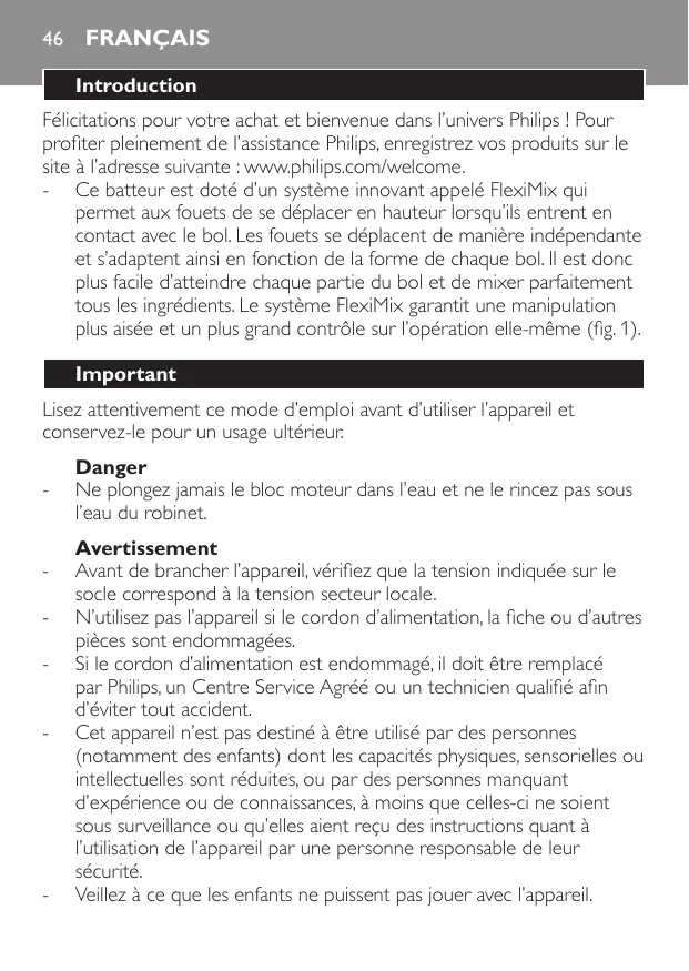 Si le cordon d’alimentation est endommagé, il doit être remplacé par Philips, un Centre Service Agréé ou un technicien qualifié afin d’éviter tout accident. Cet appareil n’est pas destiné à être utilisé par des personnes (notamment des enfants) dont les capacités physiques, sensorielles ou intellectuelles sont réduites, ou par des personnes manquant d’expérience ou de connaissances, à moins que celles-ci ne soient sous surveillance ou qu’elles aient reçu des instructions quant à l’utilisation de l’appareil par une personne responsable de leur sécurité. Veillez à ce que les enfants ne puissent pas jouer avec l’appareil.