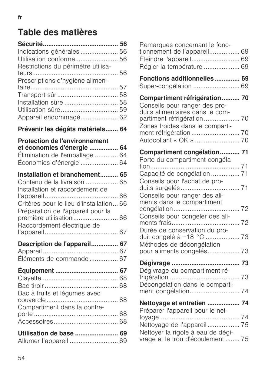 Table des matières Sécurité 56 Indications générales 56 Utilisation conforme 56 Restrictions du périmètre utilisateurs 56 Prescriptions-d’hygiène-alimentaire 57 Transport sûr 58 Installation sûre 58 Utilisation sûre 59 Appareil endommagé 62 Prévenir les dégâts matériels 64 Protection de l'environnement et économies d'énergie 64 Élimination de l'emballage 64 Économies d’énergie 64 Installation et branchement 65 Contenu de la livraison 65 Installation et raccordement de l’appareil 66 Critères pour le lieu d'installation... 66 Préparation de l'appareil pour la première utilisation 66 Raccordement électrique de l’appareil 67 Description de l'appareil 67 Appareil 67 Éléments de commande 67 Équipement 67 Clayette 68 Bac tiroir 68 Bac à fruits et légumes avec couvercle 68 Compartiment dans la contreporte 68 Accessoires 68 Utilisation de base 69 Allumer l’appareil 69 54