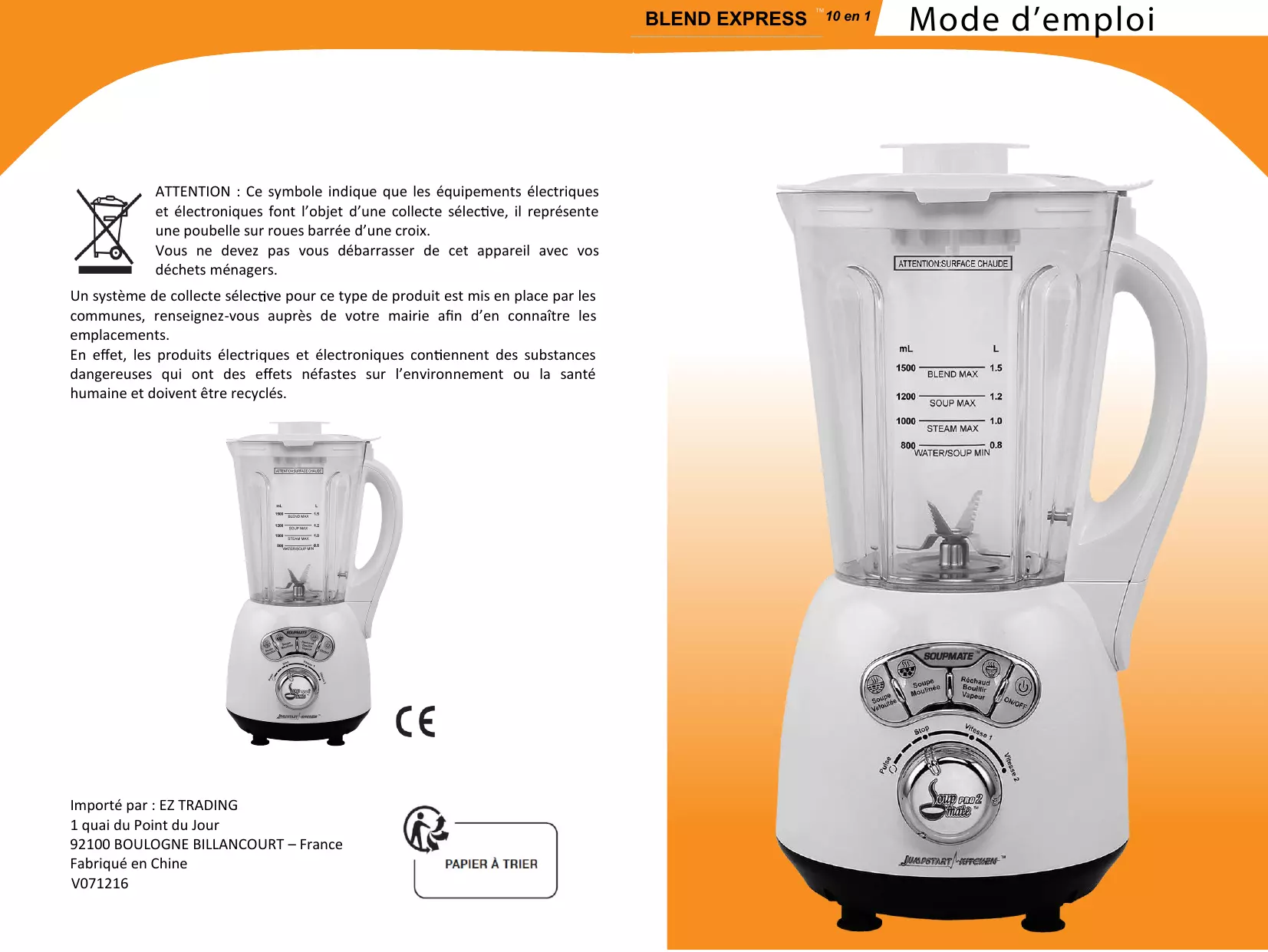 Nous vous félicitons et vous remercions d'avoir acheté le BLEND EXPRESS 10 en 1. Il s'occupe de tout et rend la cuisine plus facile. Vous pouze désormais préparer des soupes savoureuses en seulement 20 minutes. 10 appeareils de cuisine réunis dans 1 machine. Ilchauffe, bout, mixe, fouette et bien plus encore.
