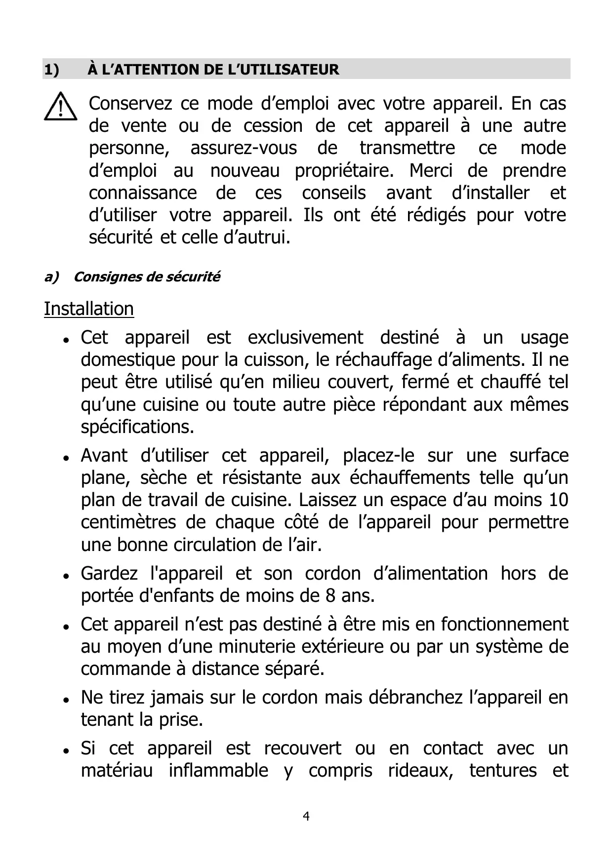 Cet appareil est exclusivement destiné à un usage domestique pour la cuisson, le réchauffage d’aliments. Il ne peut être utilisé qu’en milieu couvert, fermé et chauffé tel qu’une cuisine ou toute autre pièce répondant aux mêmes spécifications. Avant d’utiliser cet appareil, placez-le sur une surface plane, sèche et résistante aux échauffements telle qu’un plan de travail de cuisine. Laissez un espace d’au moins 10 centimètres de chaque côté de l’appareil pour permettre une bonne circulation de l’air. Gardez l'appareil et son cordon d’alimentation hors de portée d'enfants de moins de 8 ans. Cet appareil n’est pas destiné à être mis en fonctionnement au moyen d’une minuterie extérieure ou par un système de commande à distance séparé. Ne tirez jamais sur le cordon mais débranchez l’appareil en tenant la prise. Si cet appareil est recouvert ou en contact avec un matériau inflammable y compris rideaux, tentures et 4