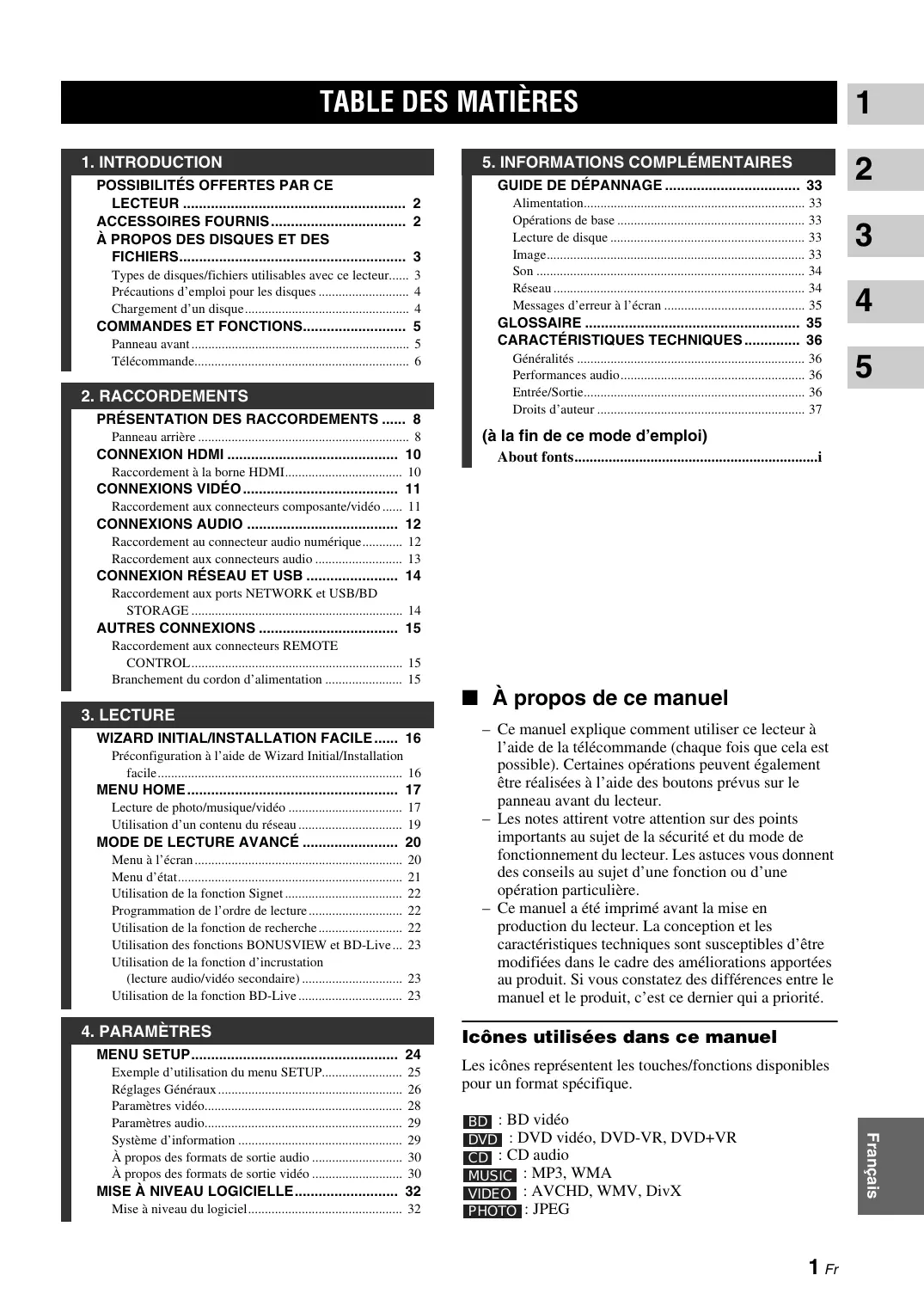 – Les notes attirent votre attention sur des points importants au sujet de la sécurité et du mode de fonctionnement du lecteur. Les astuces vous donnent des conseils au sujet d’une fonction ou d’une opération particulière. – Ce manuel a été imprimé avant la mise en production du lecteur. La conception et les caractéristiques techniques sont susceptibles d’être modifiées dans le cadre des améliorations apportées au produit. Si vous constatez des différences entre le manuel et le produit, c’est ce dernier qui a priorité.