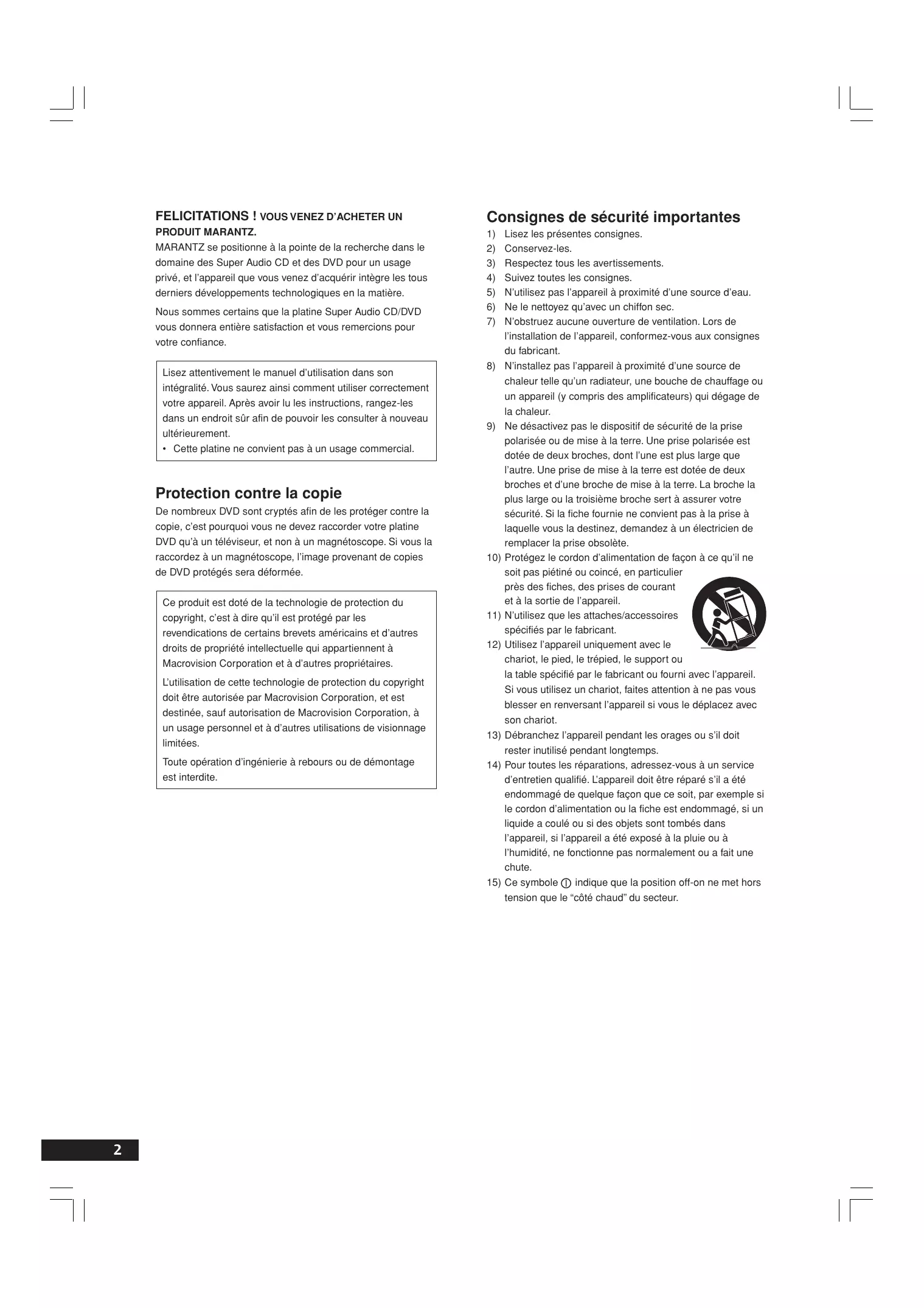 Protection contre la copie De nombreux DVD sont cryptés afin de les protéger contre la copie, c’est pourquoi vous ne devez raccorder votre platine DVD qu’à un téléviseur, et non à un magnétoscope. Si vous la raccordez à un magnétoscope, l’image provenant de copies de DVD protégés sera déformée. Ce produit est doté de la technologie de protection du copyright, c’est à dire qu’il est protégé par les revendications de certains brevets américains et d’autres droits de propriété intellectuelle qui appartiennent à Macrovision Corporation et à d’autres propriétaires. L’utilisation de cette technologie de protection du copyright doit être autorisée par Macrovision Corporation, et est destinée, sauf autorisation de Macrovision Corporation, à un usage personnel et à d’autres utilisations de visionnage limitées. Toute opération d’ingénierie à rebours ou de démontage est interdite. 10) 11) 12) 13) 14) Lisez les présentes consignes. Conservez-les. Respectez tous les avertissements. Suivez toutes les consignes. N’utilisez pas l’appareil à proximité d’une source d’eau. Ne le nettoyez qu’avec un chiffon sec. N’obstruez aucune ouverture de ventilation. Lors de l’installation de l’appareil, conformez-vous aux consignes du fabricant. N’installez pas l’appareil à proximité d’une source de chaleur telle qu’un radiateur, une bouche de chauffage ou un appareil (y compris des amplificateurs) qui dégage de la chaleur. Ne désactivez pas le dispositif de sécurité de la prise polarisée ou de mise à la terre. Une prise polarisée est dotée de deux broches, dont l’une est plus large que l’autre. Une prise de mise à la terre est dotée de deux broches et d’une broche de mise à la terre. La broche la plus large ou la troisième broche sert à assurer votre sécurité. Si la fiche fournie ne convient pas à la prise à laquelle vous la destinez, demandez à un électricien de remplacer la prise obsolète. Protégez le cordon d’alimentation de façon à ce qu’il ne soit pas piétiné ou coincé, en particulier près des fiches, des prises de courant et à la sortie de l’appareil. N’utilisez que les attaches/accessoires spécifiés par le fabricant. Utilisez l’appareil uniquement avec le chariot, le pied, le trépied, le support ou la table spécifié par le fabricant ou fourni avec l’appareil. Si vous utilisez un chariot, faites attention à ne pas vous blesser en renversant l’appareil si vous le déplacez avec son chariot. Débranchez l’appareil pendant les orages ou s’il doit rester inutilisé pendant longtemps. Pour toutes les réparations, adressez-vous à un service d’entretien qualifié. L’appareil doit être réparé s’il a été endommagé de quelque façon que ce soit, par exemple si le cordon d’alimentation ou la fiche est endommagé, si un liquide a coulé ou si des objets sont tombés dans l’appareil, si l’appareil a été exposé à la pluie ou à l’humidité, ne fonctionne pas normalement ou a fait une chute.