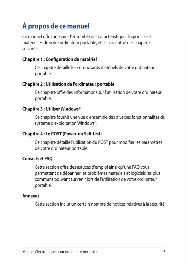 Ce chapitre détaille l'utilisation du POST pour modifier les paramètres de votre ordinateur portable. Conseils et FAQ Cette section offre des astuces d'emploi ainsi qu'une FAQ vous permettant de dépanner les problèmes matériels et logiciels les plus communs pouvant survenir lors de l'utilisation de votre ordinateur portable. Annexes Cette section inclut un certain nombre de notices relatives à la sécurité. Manuel électronique pour ordinateur portable