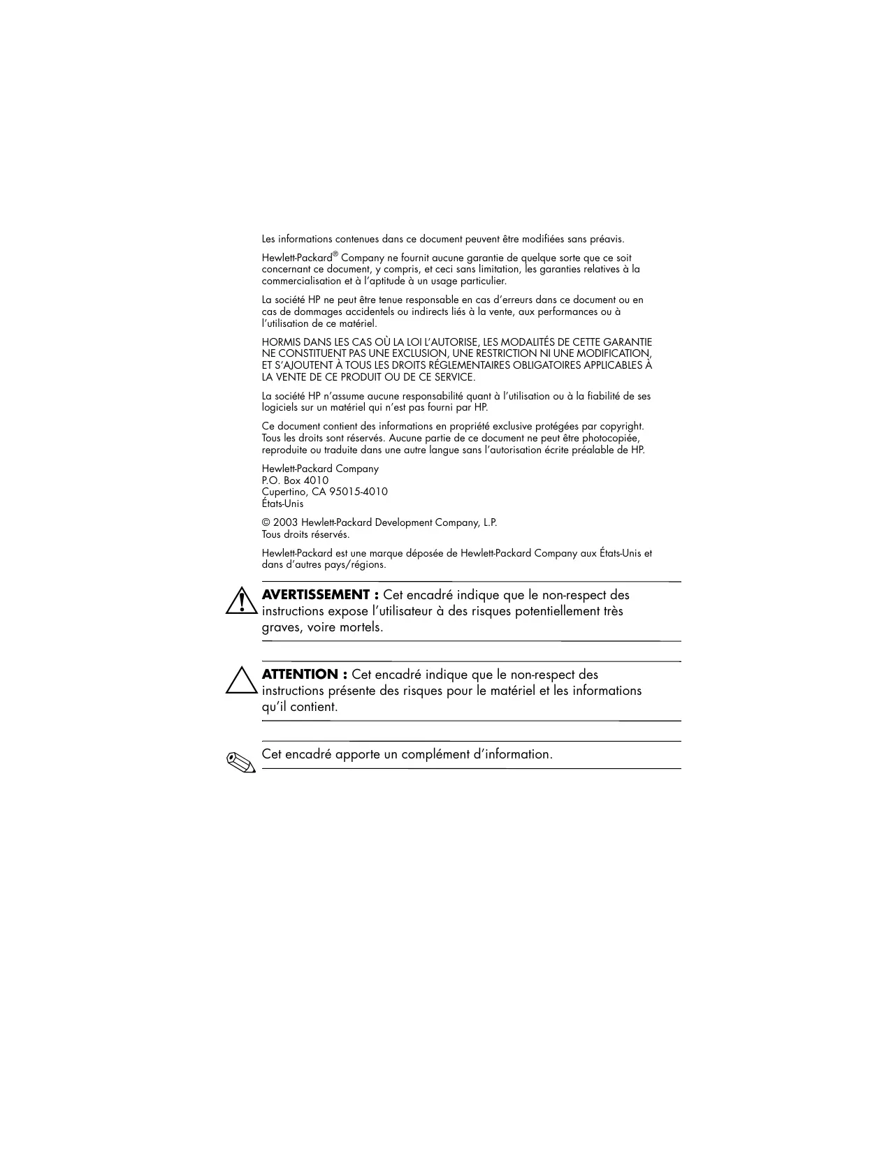Les informations contenues dans ce document peuvent être modifiées sans préavis. Hewlett-Packard® Company ne fournit aucune garantie de quelque sorte que ce soit concernant ce document, y compris, et ceci sans limitation, les garanties relatives à la commercialisation et à l’aptitude à un usage particulier. La société HP ne peut être tenue responsable en cas d’erreurs dans ce document ou en cas de dommages accidentels ou indirects liés à la vente, aux performances ou à l’utilisation de ce matériel. HORMIS DANS LES CAS OÙ LA LOI L’AUTORISE, LES MODALITÉS DE CETTE GARANTIE NE CONSTITUENT PAS UNE EXCLUSION, UNE RESTRICTION NI UNE MODIFICATION, ET S’AJOUTENT À TOUS LES DROITS RÉGLEMENTAIRES OBLIGATOIRES APPLICABLES À LA VENTE DE CE PRODUIT OU DE CE SERVICE. La société HP n’assume aucune responsabilité quant à l’utilisation ou à la fiabilité de ses logiciels sur un matériel qui n’est pas fourni par HP. Ce document contient des informations en propriété exclusive protégées par copyright. Tous les droits sont réservés. Aucune partie de ce document ne peut être photocopiée, reproduite ou traduite dans une autre langue sans l’autorisation écrite préalable de HP. Hewlett-Packard Company P.O. Box 4010 Cupertino, CA 95015-4010 2 Directives de sécurité et d’entretien Informations importantes de sécurité . . Directives d’entretien. . . . . . . . . . . . . Nettoyage du moniteur . . . . . . . . . . . Expédition du moniteur . . . . . . . . . . . Caractéristiques du produit