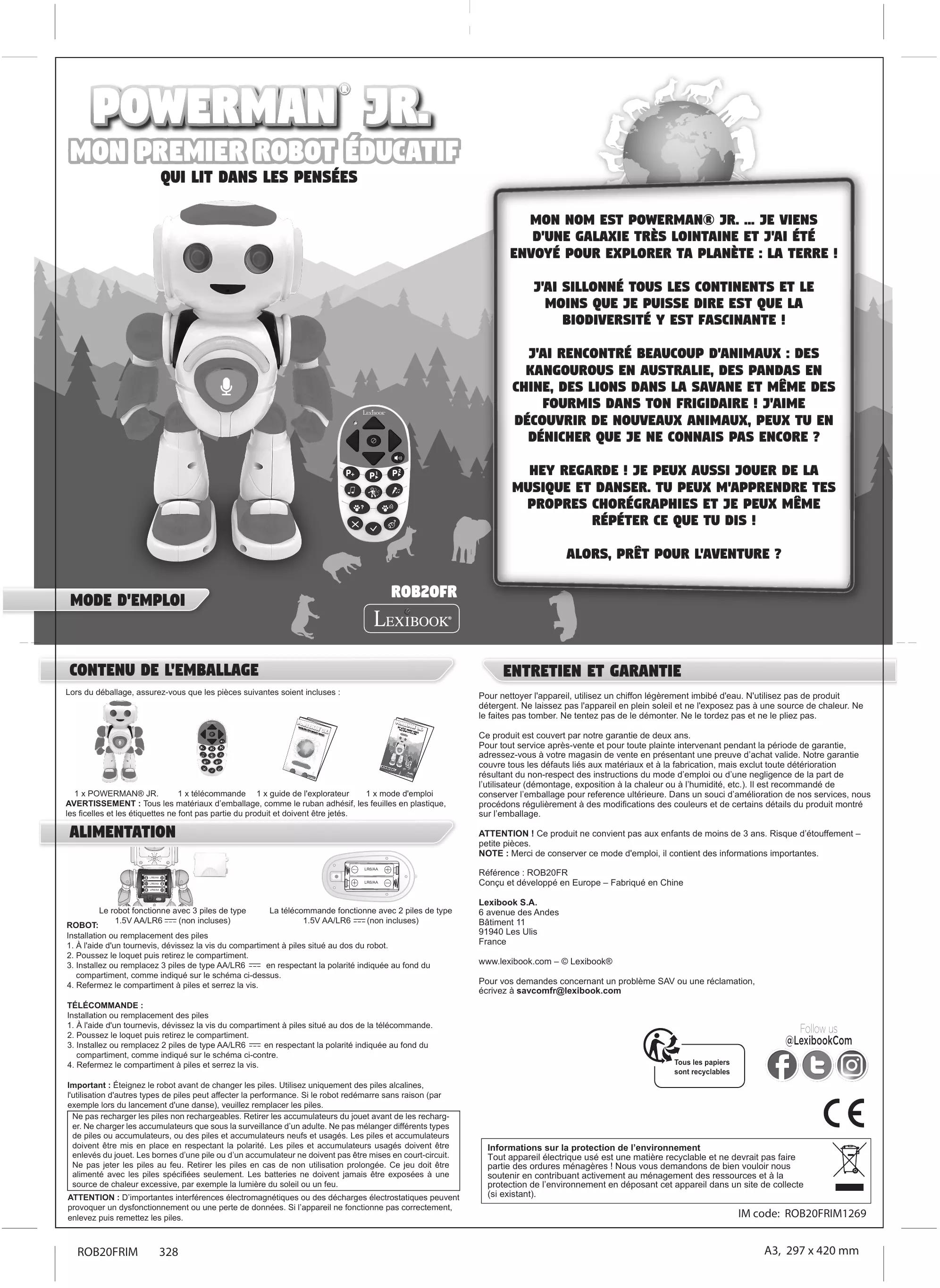 Mon premier robot éducatif Qui lit dans LES pensées Mon nom est POWERMAN® JR. ... Je viens d'une galaxie très lointaine et j'ai été envoyé pour explorer ta planète : la Terre ! J'ai sillonné tous les continents et le moins que je puisse dire est que la biodiversité Y est fascinante ! J'ai rencontré beaucoup d'animaux : des kangourous en Australie, des pandas en Chine, des lions dans la savane et même des fourmis dans ton frigidaire ! J'aime découvrir de nouveaux animaux, peux tu en dénicher que je ne connais pas ENCORE ? HEY REGARDE ! je peux aussi jouer de la musique et danser. Tu peux m'apprendre TES PROPRES chorégraphies et je peux même répéter ce que tu dis ! Alors, Prêt pour l'aventure ?