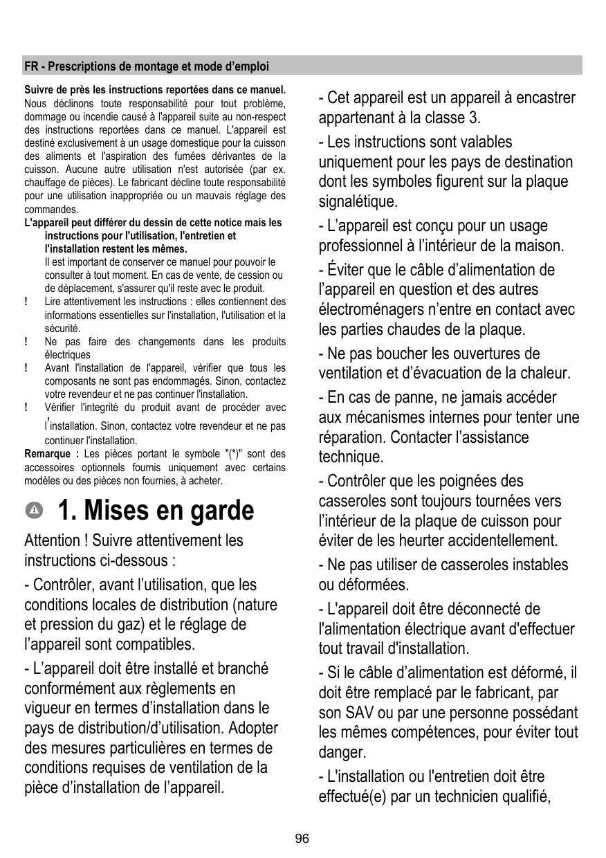ATTENTION! L'utilisation de la plaque à gaz produit de la chaleur, de l'humidité et des produits de combustion dans la piece où elle est installée. Contrôler que la piece est bien aérée notamment lorsque l'appareil est en marche. Garder les ouvertures de ventilation ouvertes ou installer un dispositif de ventilation mécanique.