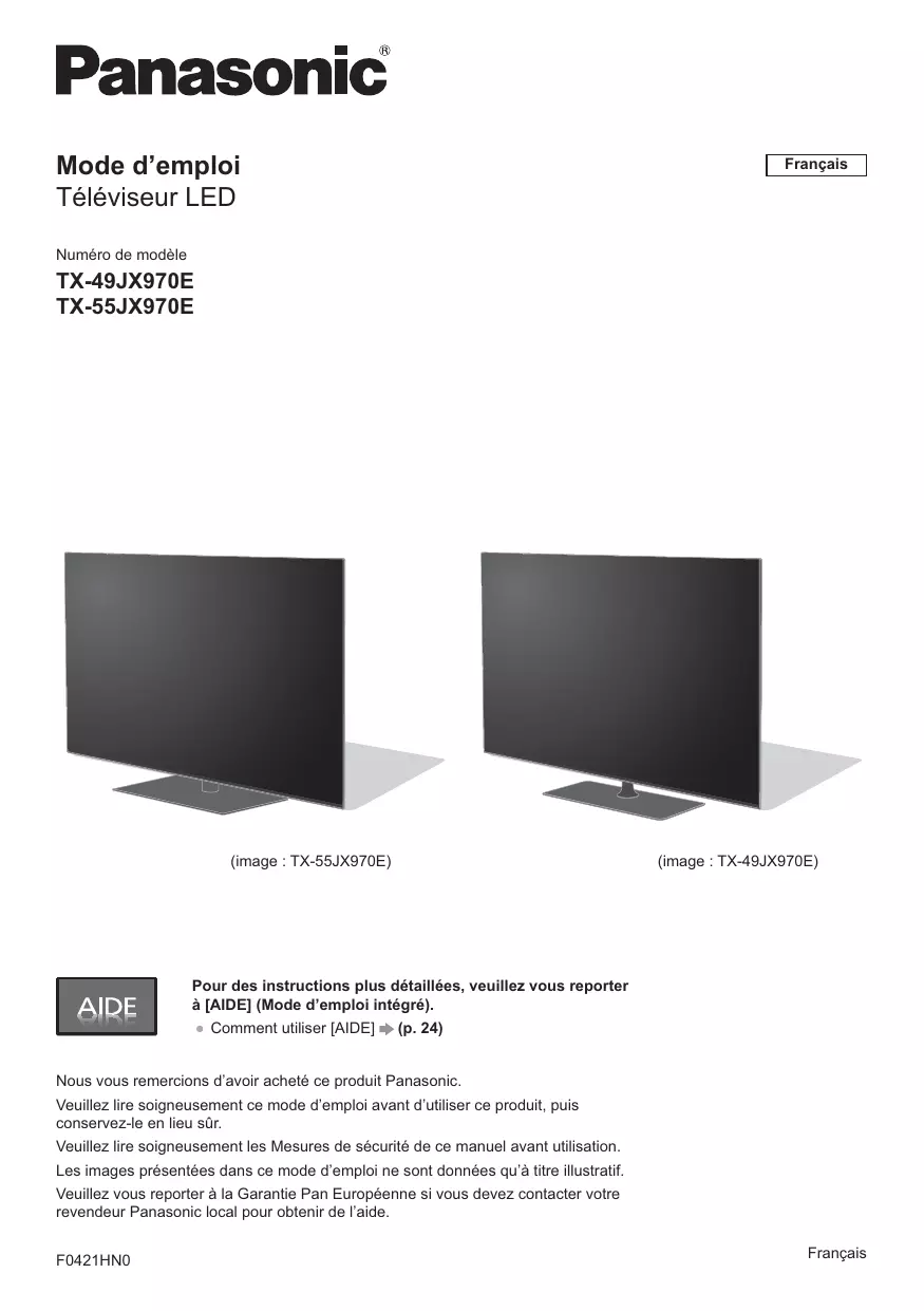 Pour des instructions plus détaillées, veuillez vous reporter à [AIDE] (Mode d’emploi intégré). Comment utiliser [AIDE] (p. 24) Nous vous remercions d’avoir acheté ce produit Panasonic. Veuillez lire soigneusement ce mode d’emploi avant d’utiliser ce produit, puis conservez-le en lieu sûr. Veuillez lire soigneusement les Mesures de sécurité de ce manuel avant utilisation. Les images présentées dans ce mode d’emploi ne sont données qu’à titre illustratif. Veuillez vous reporter à la Garantie Pan Européenne si vous devez contacter votre revendeur Panasonic local pour obtenir de l’aide. F0421HN0