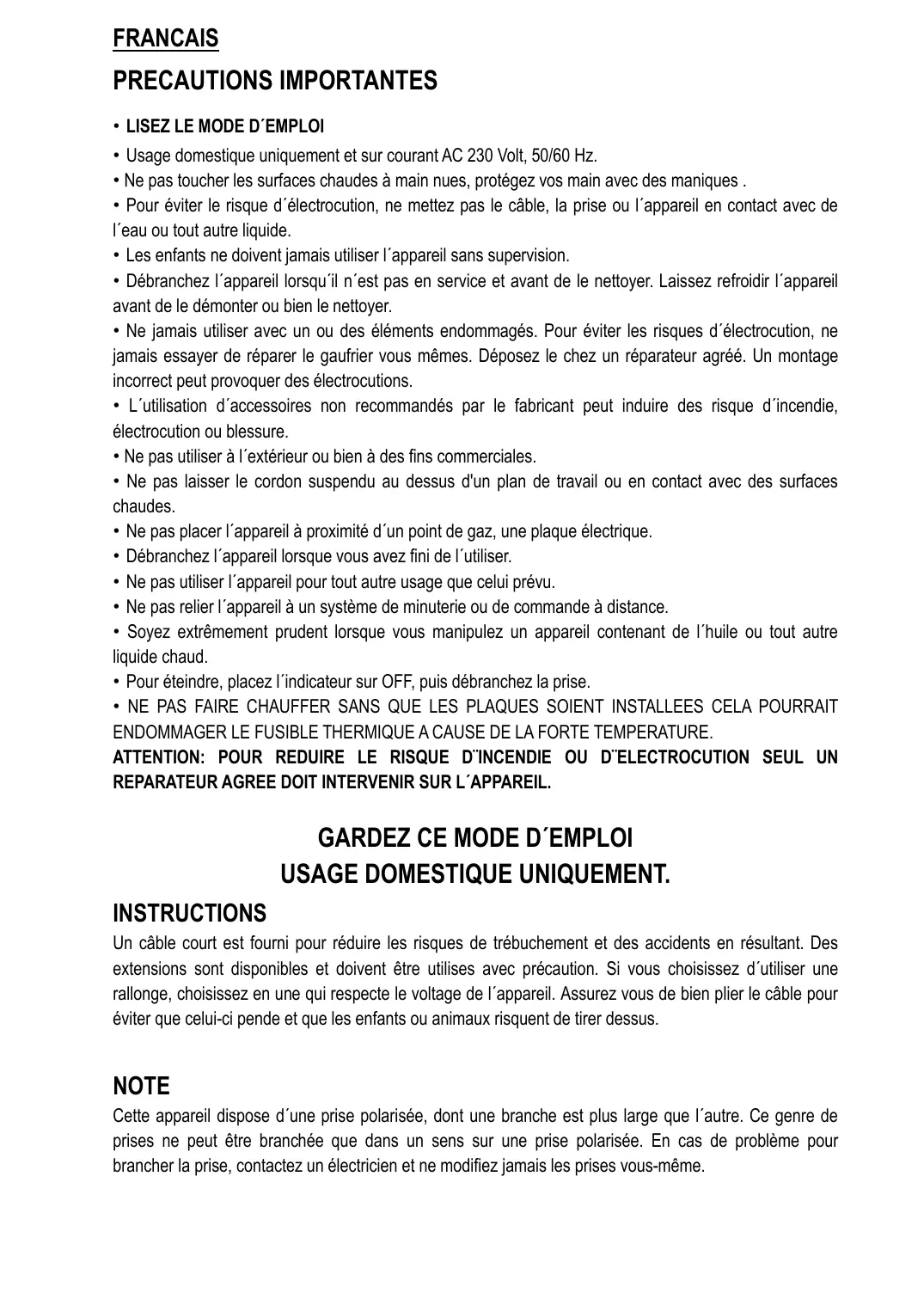 GARDEZ CE MODE D'EMPLOI USAGE DOMESTIQUE UNIQUEMENT.