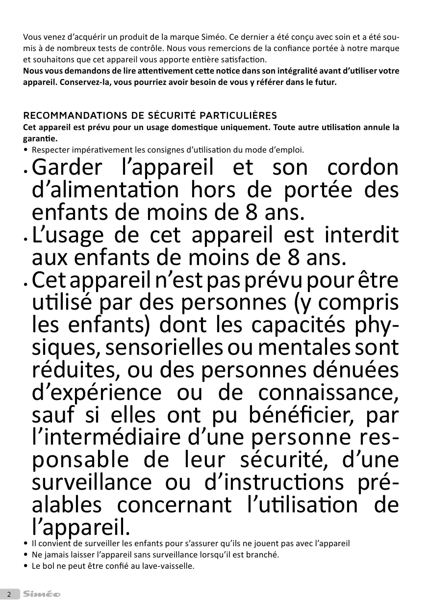 Vou venez d'acquerir un produit de la marque Siméo. Ce dernier a été unconçu avec soin et a été soumis à des nombreux tests de contrôle. Nous vous remercions de la confiance portée à notre marque et sou Haitons que cet apparéil vous apporte entière satisfaction.