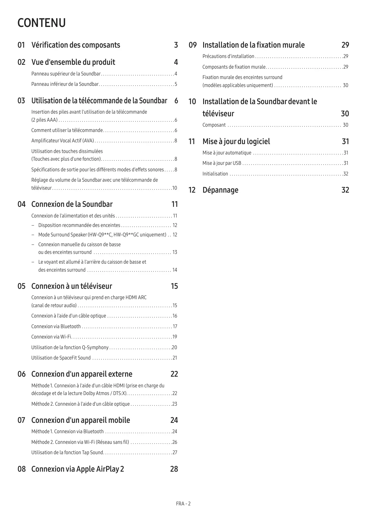 Connexion à un téléviseur qui prend en charge HDMI ARC (canal de retour audio). . . . . . . . . . . . . . . . . . . . . . . . . . . . . . . . . . . . . . . . . . . . . 15 Connexion à l'aide d'un câble optique . . . . . . . . . . . . . . . . . . . . . . . . . . . . . . . 16 Connexion via Bluetooth. . . . . . . . . . . . . . . . . . . . . . . . . . . . . . . . . . . . . . . . . . . .17 Connexion via Wi-Fi . . . . . . . . . . . . . . . . . . . . . . . . . . . . . . . . . . . . . . . . . . . . . . . 19 Utilisation de la fonction Q-Symphony . . . . . . . . . . . . . . . . . . . . . . . . . . . . . .20 Utilisation de SpaceFit Sound . . . . . . . . . . . . . . . . . . . . . . . . . . . . . . . . . . . . . . 21