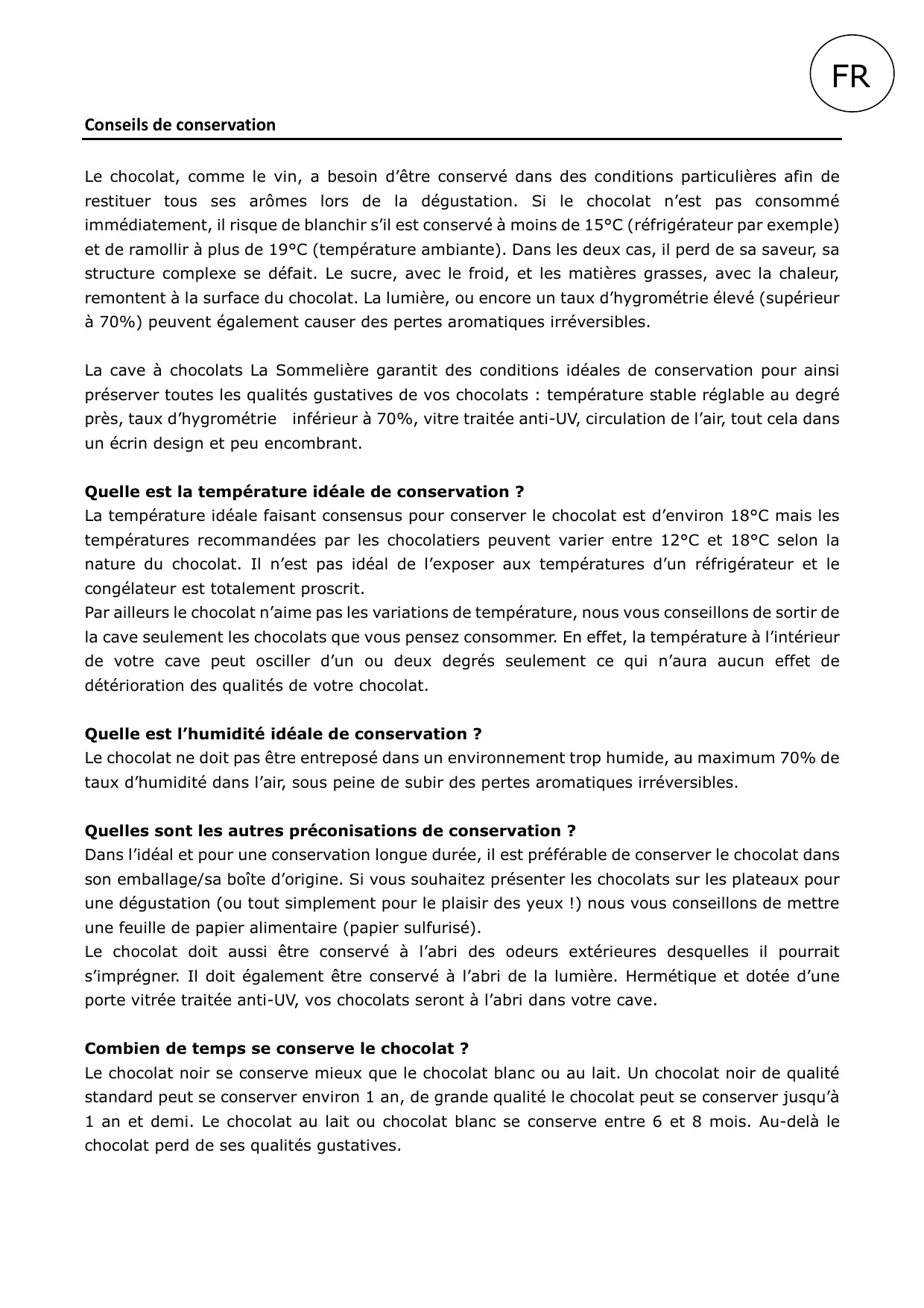 FR Conseils de conservation Le chocolat, comme le vin, a besoin d’être conservé dans des conditions particulières afin de restituer tous ses arômes lors de la dégustation. Si le chocolat n’est pas consommé immédiatement, il risque de blanchir s’il est conservé à moins de 15°C (réfrigérateur par exemple) et de ramollir à plus de 19°C (température ambiante). Dans les deux cas, il perd de sa saveur, sa structure complexe se défait. Le sucre, avec le froid, et les matières grasses, avec la chaleur, remontent à la surface du chocolat. La lumière, ou encore un taux d’hygrométrie élevé (supérieur à 70%) peuvent également causer des pertes aromatiques irréversibles. La cave à chocolats La Sommelière garantit des conditions idéales de conservation pour ainsi préserver toutes les qualités gustatives de vos chocolats : température stable réglable au degré près, taux d’hygrométrie