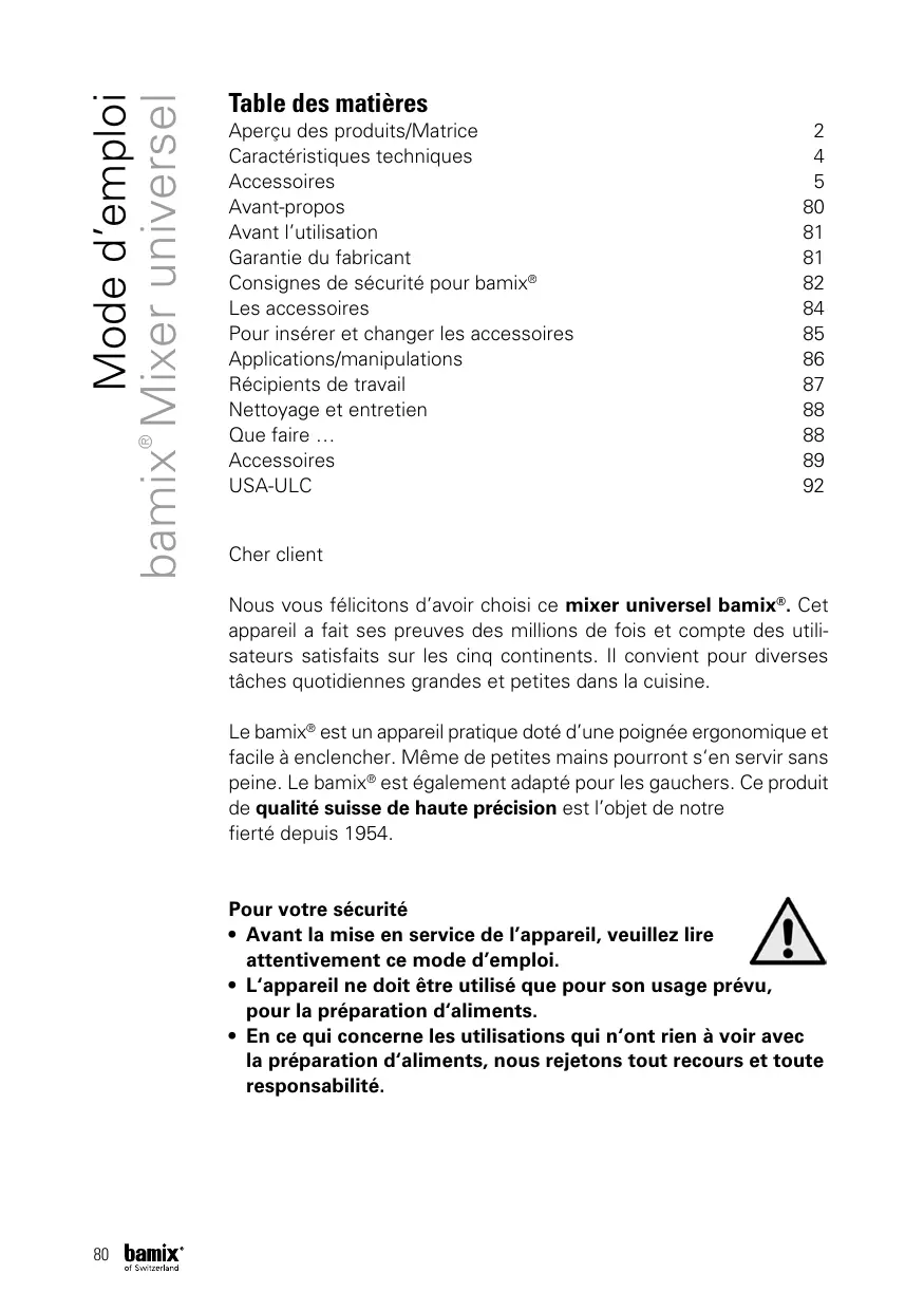 • Lorsque l‘appareil est laissé sans surveillance ou avant son installation, son démontage ou son nettoyage, il faut toujours le débrancher • Ne pas poser l’appareil sur des surfaces chaudes ou à proximité de flammes de gaz, pour éviter que le boîtier ne fonde • L’appareil ne doit être plongé dans un liquide que jusqu’au-dessous de la séparation de la poignée et du boîtier • L’appareil et le capot de protection ne doivent pas être nettoyés dans un lave-vaisselle • Nettoyer l’appareil seulement avec un chiffon humide • Retirez la prise secteur lorsque vous manipulez la coupole de protection ou les accessoires pour nettoyer l’appareil sous l’eau courante ou pour changer un accessoire • N’enclenchez l’appareil qu’après avoir plongé le tube dans le récipient de travail • Le bamix® est doté d’un interrupteur de sécurité prévenant toute mise en service intempestive, et qui arrête instantanément l’appareil dès qu’il est relâché • Si le cable de cet appareil est endommagée, elle devra être remplacée par le fabricant ou son service après-vente ou par une personne possédant des qualifications équivalentes pour éviter tout danger • Débrancher la prise secteur en cas de dérangement lors de l‘utilisation et après l’utilisation • Ne retirez jamais la fiche secteur hors de la prise lorsque vous avez les mains mouillées • Ne porter ni ne tirer jamais l’appareil par son cordon • Le cordon secteur ne doit pas reposer sur des arêtes tranchantes ni être pincé • Evitez de placer le cordon sur des objets chauds ou à proximité de flammes de gaz, et protégez-le de la chaleur et de l’huile • Ne mettez jamais l’appareil en service quand: – l’appareil, son boîtier ou son cordon secteur sont endommagés, – au moindre soupçon de défaut après une chute ou autre circonstance similaire. Dans ce cas, confier l’appareil à notre service de réparation •