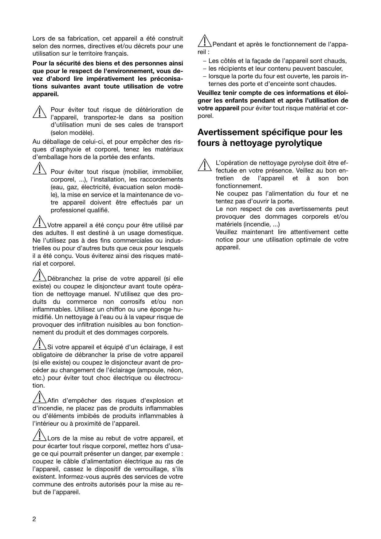 Pendant et après le fonctionnement de l’appareil : – Les côtés et la façade de l’appareil sont chauds, – les récipients et leur contenu peuvent basculer, – lorsque la porte du four est ouverte, les parois internes des porte et d’enceinte sont chaudes. Veuillez tenir compte de ces informations et éloigner les enfants pendant et après l’utilisation de votre appareil pour éviter tout risque matérial et corporel. Avertissement spécifique pour les fours à nettoyage pyrolytique 1 L’opération de nettoyage pyrolyse doit être ef- fectuée en votre présence. Veillez au bon entretien de l’appareil et à son bon fonctionnement. Ne coupez pas l’alimentation du four et ne tentez pas d’ouvrir la porte. Le non respect de ces avertissements peut provoquer des dommages corporels et/ou matériels (incendie, ...) Veuillez maintenant lire attentivement cette notice pour une utilisation optimale de votre appareil. Chère cliente, cher client, Veuillez lire attentivement la notice d’utilisation dans son intégralité et la conserver pour pouvoir le consulter ultérieurement. Veuillez la transmettre à l’éventuel propriétaire ultérieur de l’appareil. Les symboles suivants sont utilisés dans ce document : 1 Consignes de sécurité Avertissement ! Conseils pour votre sécurité personnelle. Avertissement ! Consignes permettant d’éviter d’endommager l’appareil. 3 Conseils généraux et pratiques 2 Informations environnementales