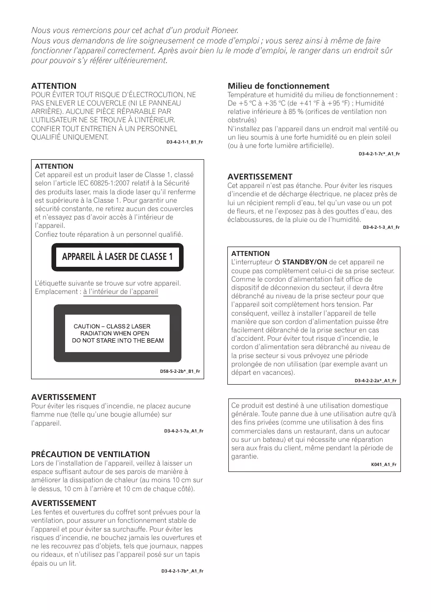 NOTE IMPORTANTE SUR LE CABLE D’ALIMENTATION Tenir le câble d’alimentation par la fiche. Ne pas débrancher la prise en tirant sur le câble et ne pas toucher le câble avec les mains mouillées. Cela risque de provoquer un court-circuit ou un choc électrique. Ne pas poser l’appareil ou un meuble sur le câble. Ne pas pincer le câble. Ne pas faire de noeud avec le câble ou l’attacher à d’autres câbles. Les câbles d’alimentation doivent être posés de façon à ne pas être écrasés. Un câble abîmé peut provoquer un risque d’incendie ou un choc électrique. Vérifier le câble d’alimentation de temps en temps. Contacter le service après-vente PIONEER le plus proche ou le revendeur pour un remplacement. S002*_A1_Fr