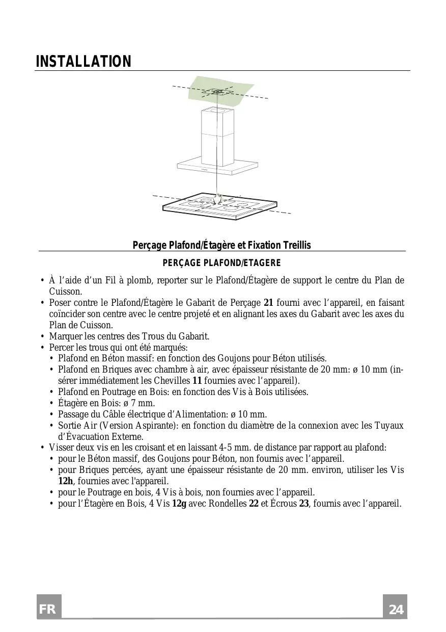 - La fixation du treillis doit être ferme tant par rapport au poids de la hotte qu’en ce qui concerne les contraintes résultant des poussées latérales occasionnelles subies par l’appareil une fois monté. Une fois fixé, vérifier que la base est stable même si le treillis fait l'objet d’efforts en flexion.