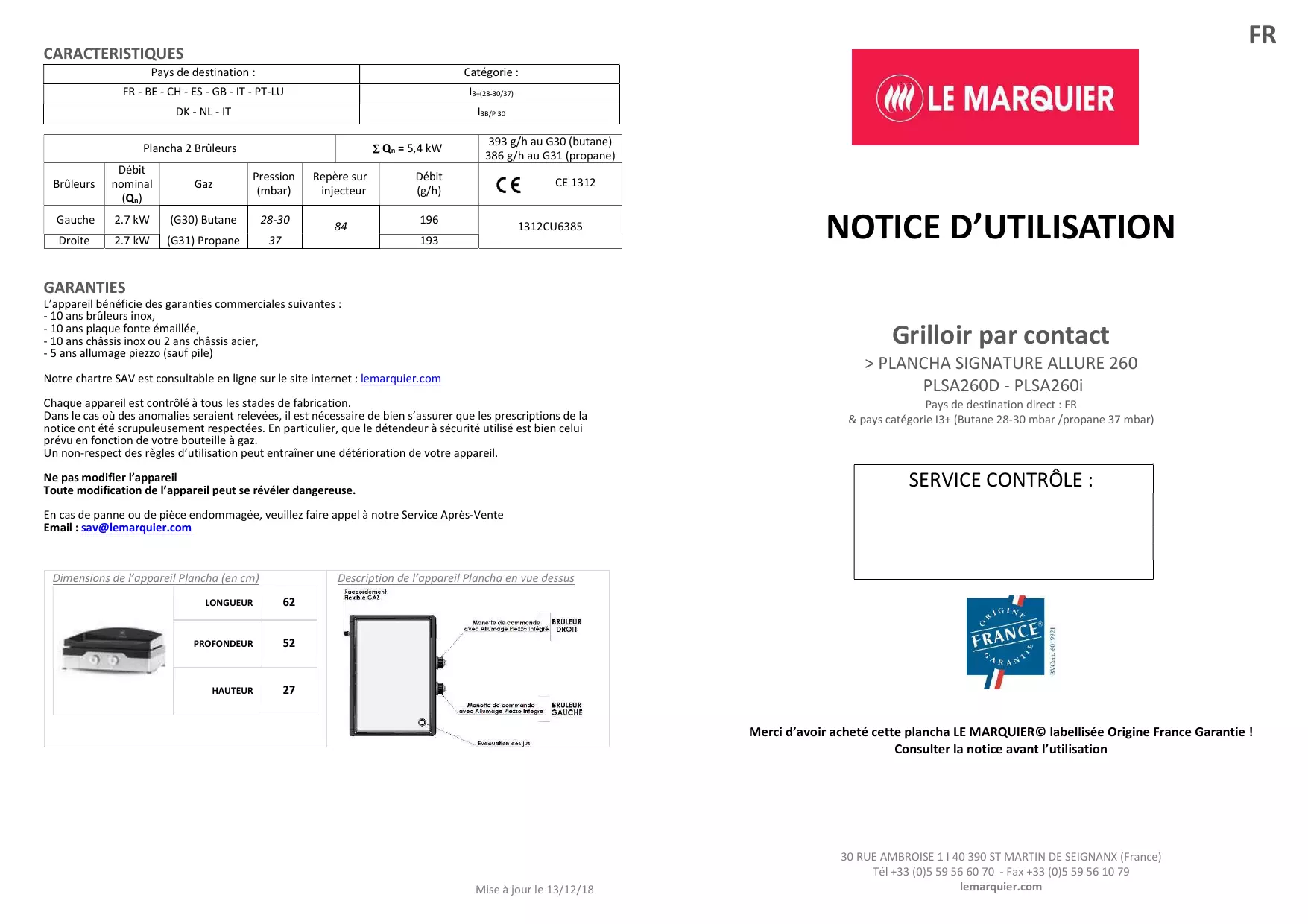 Merci d'avoir acheté cette plancha LE MARQUIER© labellisée Origine France Garantie! Consultant la notice avant l'utilisation