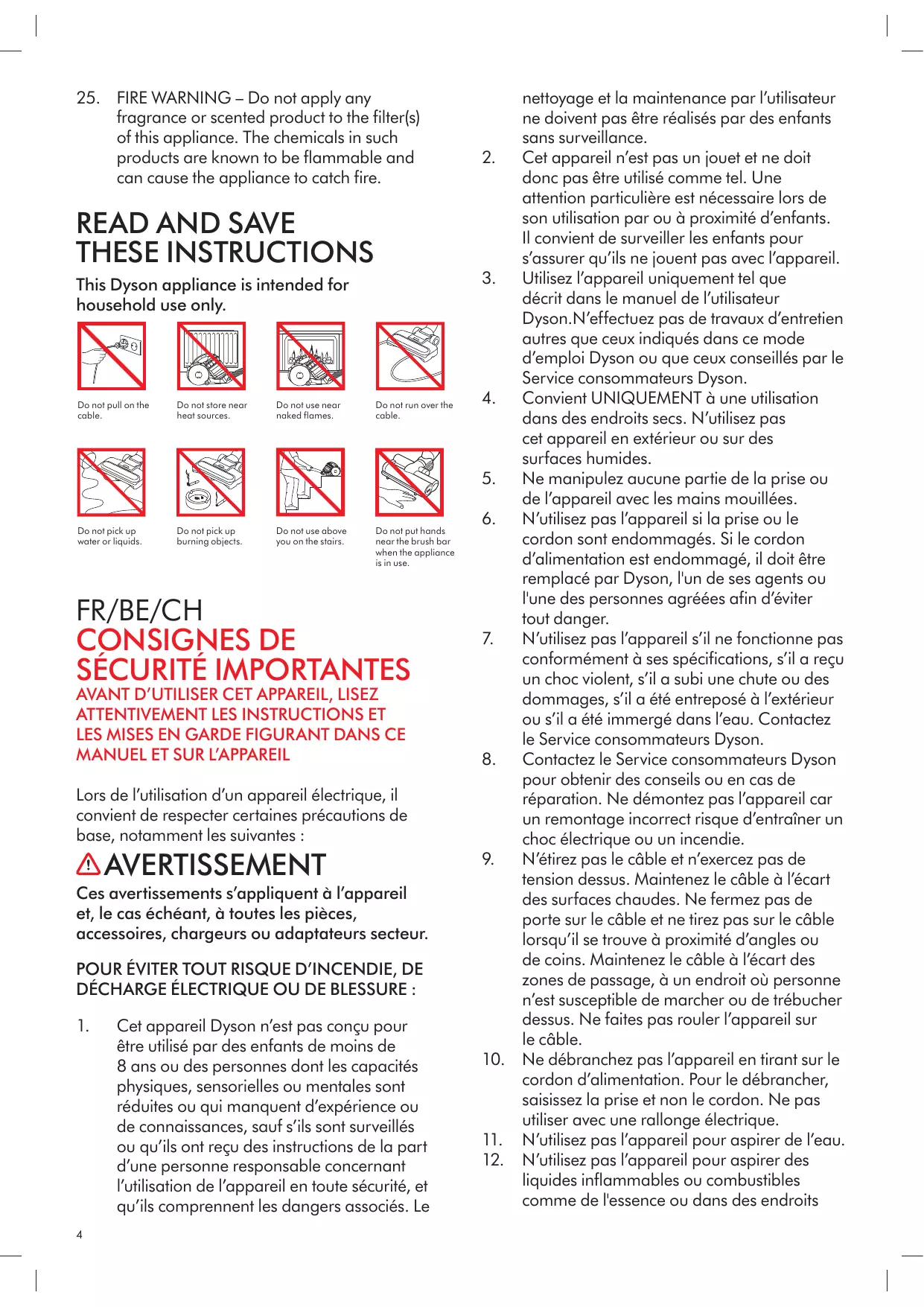 2. Cet appareil n’est pas un jouet et ne doit donc pas être utilisé comme tel. Une attention particulière est nécessaire lors de son utilisation par ou à proximité d’enfants. Il convient de surveiller les enfants pour s’assurer qu’ils ne jouent pas avec l’appareil. 3. Utilisez l’appareil uniquement tel que décrit dans le manuel de l’utilisateur Dyson.N’effectuez pas de travaux d’entretien autres que ceux indiqués dans ce mode d’emploi Dyson ou que ceux conseillés par le Service consommateurs Dyson. 4. Convient UNIQUEMENT à une utilisation dans des endroits secs. N’utilisez pas cet appareil en extérieur ou sur des surfaces humides. 5. Ne manipulez aucune partie de la prise ou de l’appareil avec les mains mouillées. 6. N’utilisez pas l’appareil si la prise ou le cordon sont endommagés. Si le cordon d’alimentation est endommagé, il doit être remplacé par Dyson, l'un de ses agents ou l'une des personnes agréées afin d’éviter tout danger. 7. N’utilisez pas l’appareil s’il ne fonctionne pas conformément à ses spécifications, s’il a reçu un choc violent, s’il a subi une chute ou des dommages, s’il a été entreposé à l’extérieur ou s’il a été immergé dans l’eau. Contactez le Service consommateurs Dyson. 8. Contactez le Service consommateurs Dyson pour obtenir des conseils ou en cas de réparation. Ne démontez pas l’appareil car un remontage incorrect risque d’entraîner un choc électrique ou un incendie. 9. N’étirez pas le câble et n’exercez pas de tension dessus. Maintenez le câble à l’écart des surfaces chaudes. Ne fermez pas de porte sur le câble et ne tirez pas sur le câble lorsqu’il se trouve à proximité d’angles ou de coins. Maintenez le câble à l’écart des zones de passage, à un endroit où personne n’est susceptible de marcher ou de trébucher dessus. Ne faites pas rouler l’appareil sur le câble. 10. Ne débranchez pas l’appareil en tirant sur le cordon d’alimentation. Pour le débrancher, saisissez la prise et non le cordon. Ne pas utiliser avec une rallonge électrique. 11. N’utilisez pas l’appareil pour aspirer de l’eau. 12. N’utilisez pas l’appareil pour aspirer des liquides inflammables ou combustibles comme de l'essence ou dans des endroits