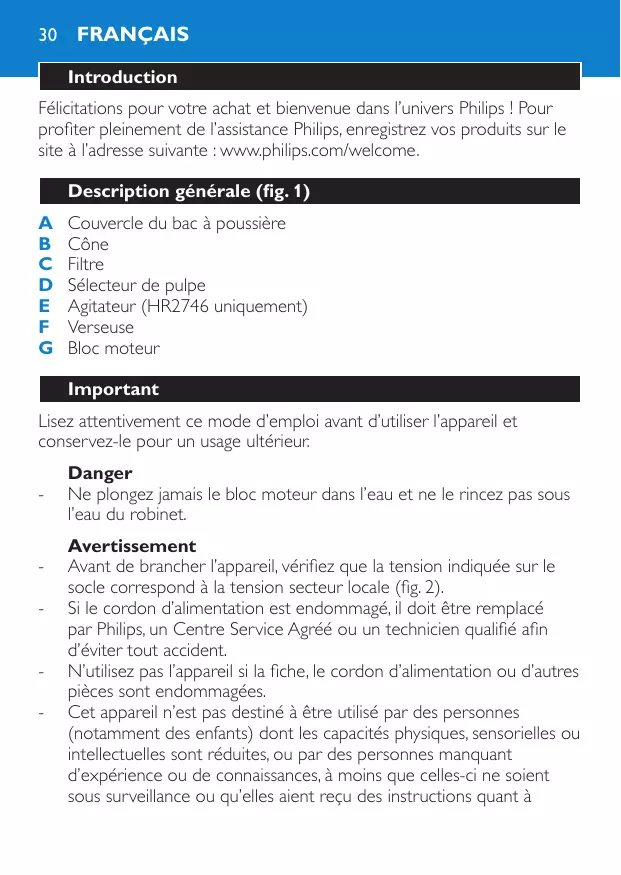 Para conseguir zumo sin pulpa ni pepitas, ponga el selector de pulpa en la posición m. (fig. 5) Si le cordon d’alimentation est endommagé, il doit être remplacé par Philips, un Centre Service Agréé ou un technicien qualifié afin d’éviter tout accident. N’utilisez pas l’appareil si la fiche, le cordon d’alimentation ou d’autres pièces sont endommagées. Cet appareil n’est pas destiné à être utilisé par des personnes (notamment des enfants) dont les capacités physiques, sensorielles ou intellectuelles sont réduites, ou par des personnes manquant d’expérience ou de connaissances, à moins que celles-ci ne soient sous surveillance ou qu’elles aient reçu des instructions quant à