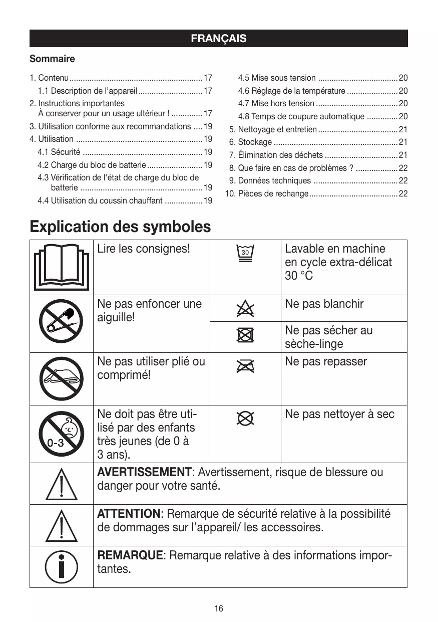 - Le coussin chauffant ne doit pas etre nettoyé avec des produits chimiques, essore, séché en machine, cylindré ou repassedé. Sinon, il pourrait etre endommagé.