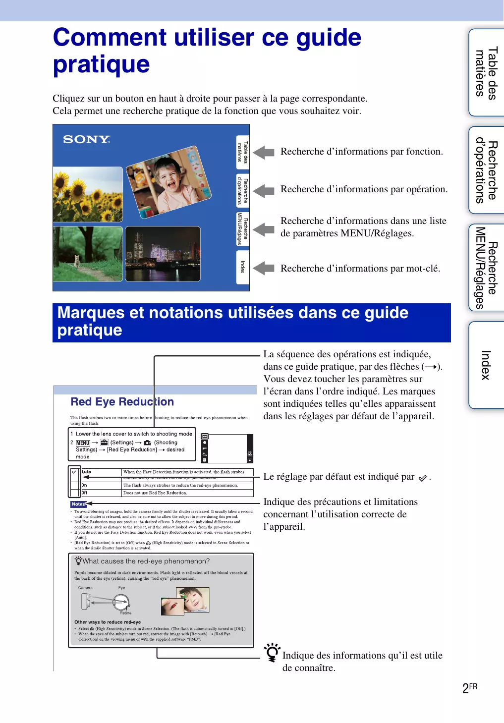 Comment utiliser ce guide pratique······················· 2 Remarques sur l’utilisation de l’appareil················ 3 Recherche d’opérations ········································ 8 Recherche MENU/Réglages ······························· 11 Noms des pièces················································· 16 Liste des icônes affichées sur l’écran ················· 17 Utilisation du panneau tactile ······························ 19 Personnalisation des paramètres MENU ············ 21 Utilisation de la mémoire interne························· 22