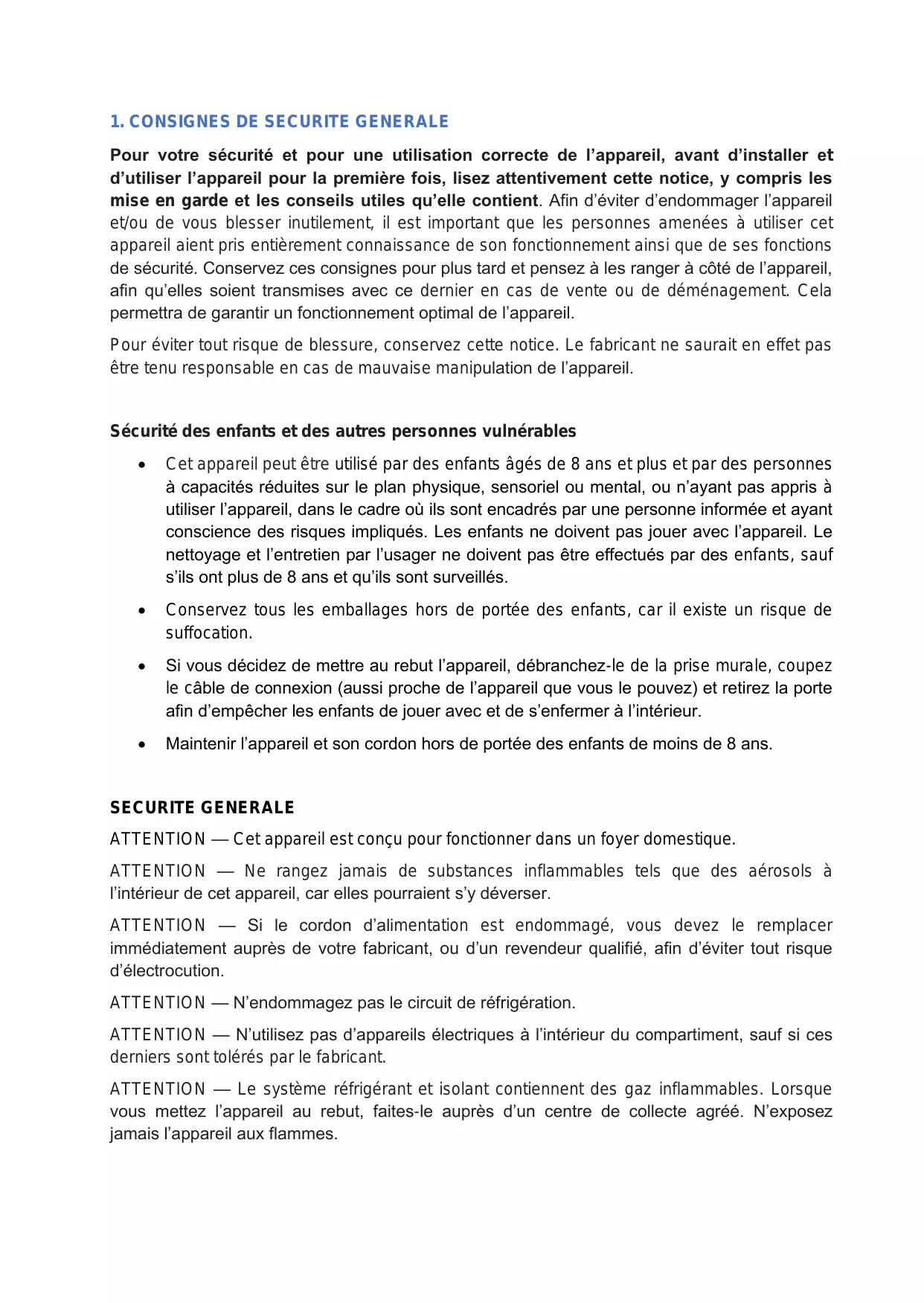 SECURITE GENERALE ATTENTION — Cet appareil est conçu pour fonctionner dans un foyer domestique. ATTENTION — Ne rangez jamais de substances inflammables tels que des aérosols à l’intérieur de cet appareil, car elles pourraient s’y déverser. ATTENTION — Si le cordon d’alimentation est endommagé, vous devez le remplacer immédiatement auprès de votre fabricant, ou d’un revendeur qualifié, afin d’éviter tout risque d’électrocution. ATTENTION — N’endommagez pas le circuit de réfrigération. ATTENTION — N’utilisez pas d’appareils électriques à l’intérieur du compartiment, sauf si ces derniers sont tolérés par le fabricant. ATTENTION — Le système réfrigérant et isolant contiennent des gaz inflammables. Lorsque vous mettez l’appareil au rebut, faites-le auprès d’un centre de collecte agréé. N’exposez jamais l’appareil aux flammes.