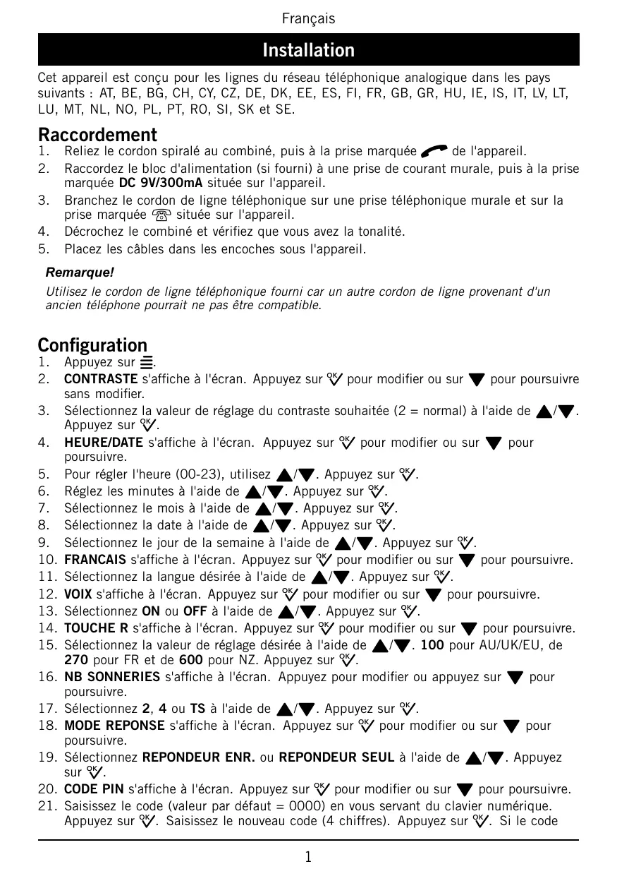 Reliez le cordon spiralé au combiné, puis à la prise marquée q de l'appareil. Raccordez le bloc d'alimentation (si fourni) à une prise de courant murale, puis à la prise marquée DC 9V/300mA située sur l'appareil. Branchez le cordon de ligne téléphonique sur une prise téléphonique murale et sur la prise marquée K située sur l'appareil. Décrochez le combiné et vérifiez que vous avez la tonalité. Placez les câbles dans les encoches sous l'appareil. Remarque! Utilisez le cordon de ligne téléphonique fourni car un autre cordon de ligne provenant d'un ancien téléphone pourrait ne pas être compatible. Configuration