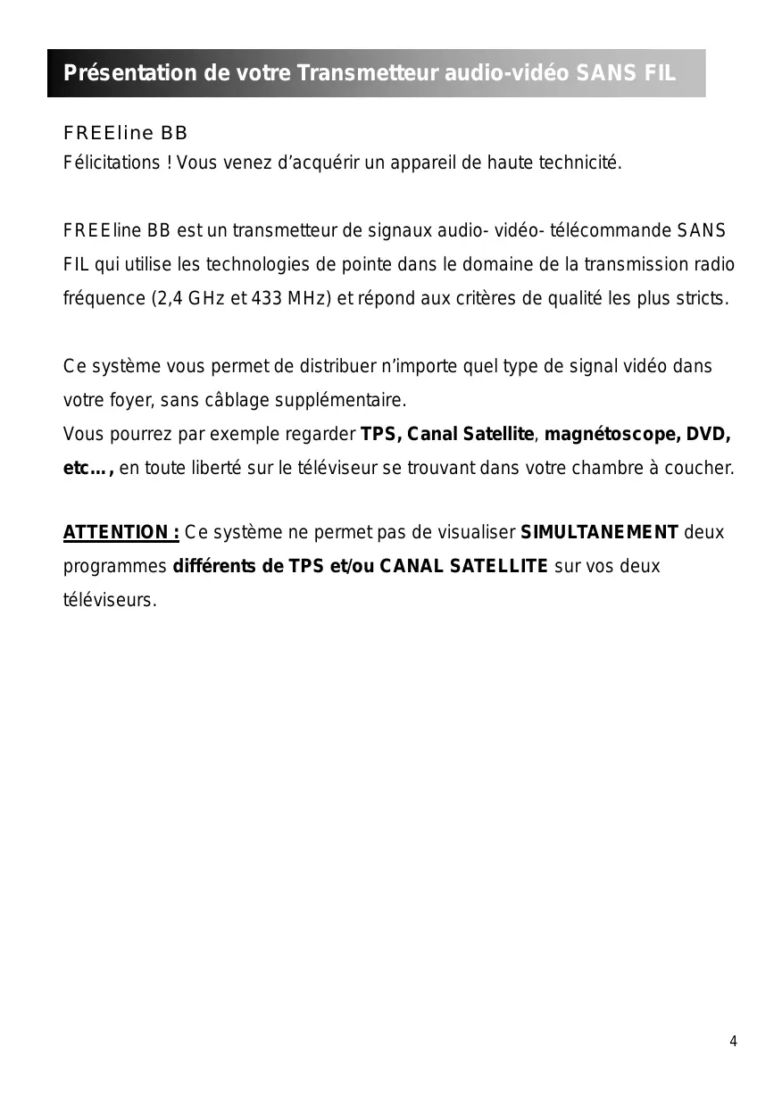 FREEline BB est un transmetteur de signaux audio- video-télécommande SANS FIL qui utilise les technologies de pointe dans le domaine de la transmission radio fréquence (2,4 GHz et 433 MHz) et répond aux critères de qualité les plus stricts.