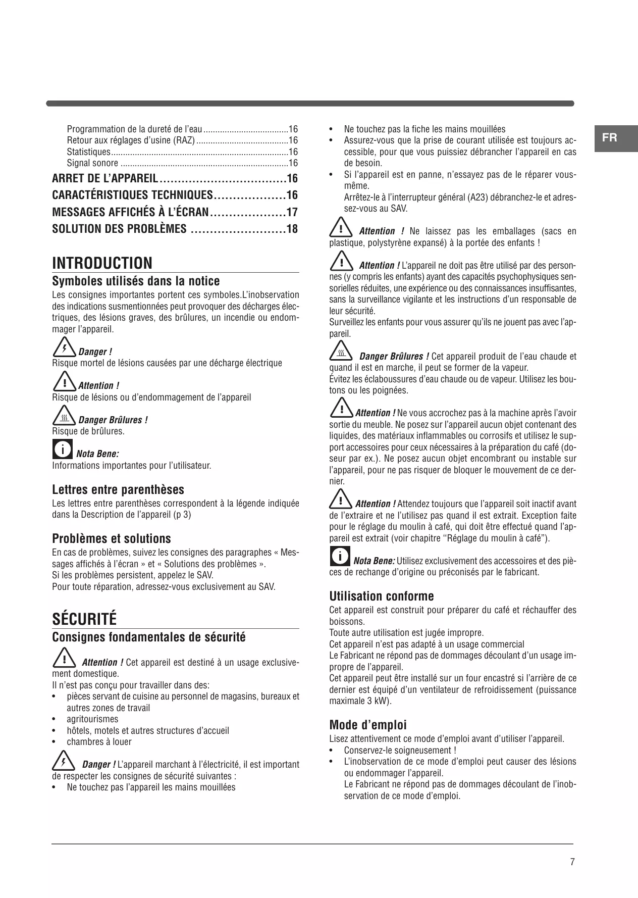 - Ne touchez pas l’appareil les mains mouillées Ne touchez pas la fiche les mains mouillées Assurez-vous que la prise de courant utilisée est toujours accessible, pour que vous puissiez débrancher l’appareil en cas de besoin. Si l’appareil est en panne, n’essayez pas de le réparer vousmême. Arrêtez-le à l’interrupteur général (A23) débranchez-le et adressez-vous au SAV. Attention ! Ne laissez pas les emballages (sacs en plastique, polystyrène expansé) à la portée des enfants ! Attention ! L’appareil ne doit pas être utilisé par des personnes (y compris les enfants) ayant des capacités psychophysiques sensorielles réduites, une expérience ou des connaissances insuffisantes, sans la surveillance vigilante et les instructions d’un responsable de leur sécurité. Surveillez les enfants pour vous assurer qu’ils ne jouent pas avec l’appareil. Danger Brûlures ! Cet appareil produit de l’eau chaude et quand il est en marche, il peut se former de la vapeur. Évitez les éclaboussures d’eau chaude ou de vapeur. Utilisez les boutons ou les poignées. Attention ! Ne vous accrochez pas à la machine après l’avoir sortie du meuble. Ne posez sur l’appareil aucun objet contenant des liquides, des matériaux inflammables ou corrosifs et utilisez le support accessoires pour ceux nécessaires à la préparation du café (doseur par ex.). Ne posez aucun objet encombrant ou instable sur l’appareil, pour ne pas risquer de bloquer le mouvement de ce dernier. Attention ! Attendez toujours que l’appareil soit inactif avant de l’extraire et ne l’utilisez pas quand il est extrait. Exception faite pour le réglage du moulin à café, qui doit être effectué quand l’appareil est extrait (voir chapitre ‘‘Réglage du moulin à café”). Nota Bene: Utilisez exclusivement des accessoires et des pièces de rechange d’origine ou préconisés par le fabricant. Utilisation conforme Cet appareil est construit pour préparer du café et réchauffer des boissons. Toute autre utilisation est jugée impropre. Cet appareil n’est pas adapté à un usage commercial Le Fabricant ne répond pas de dommages découlant d’un usage impropre de l’appareil. Cet appareil peut être installé sur un four encastré si l’arrière de ce dernier est équipé d’un ventilateur de refroidissement (puissance maximale 3 kW). Mode d’emploi Lisez attentivement ce mode d’emploi avant d’utiliser l’appareil.