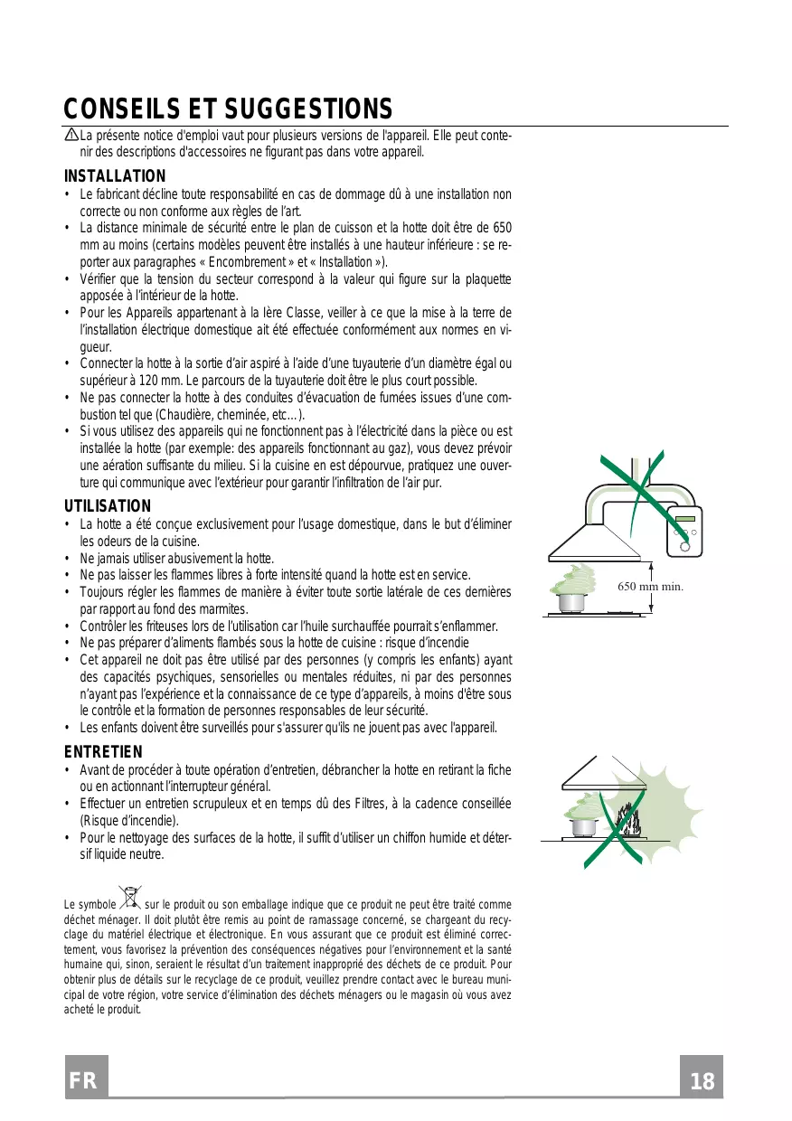 - La distance minimale de sécurité entre le plan de cuisson et la hotte doit être de 650 mm au moins (certains modèles peuvent être installés à une hauteur inférieure : se reporter aux paragraphs « Encombrement » et « Installation »).