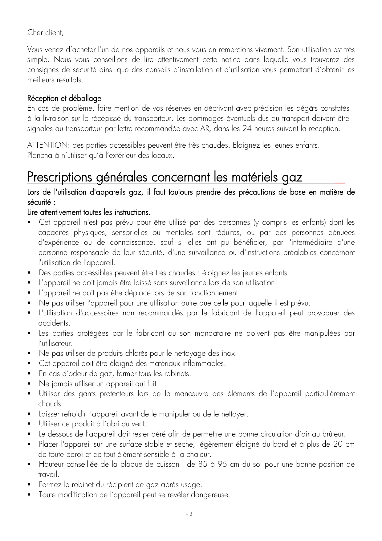 Cher client, Vous venez d’acheter l’un de nos appareils et nous vous en remercions vivement. Son utilisation est très simple. Nous vous conseillons de lire attentivement cette notice dans laquelle vous trouverez des consignes de sécurité ainsi que des conseils d’installation et d’utilisation vous permettant d’obtenir les meilleurs résultats. Réception et déballage En cas de problème, faire mention de vos réserves en décrivant avec précision les dégâts constatés à la livraison sur le récépissé du transporteur. Les dommages éventuels dus au transport doivent être signalés au transporteur par lettre recommandée avec AR, dans les 24 heures suivant la réception. ATTENTION: des parties accessibles peuvent être très chaudes. Eloignez les jeunes enfants. Plancha à n’utiliser qu’à l’extérieur des locaux.