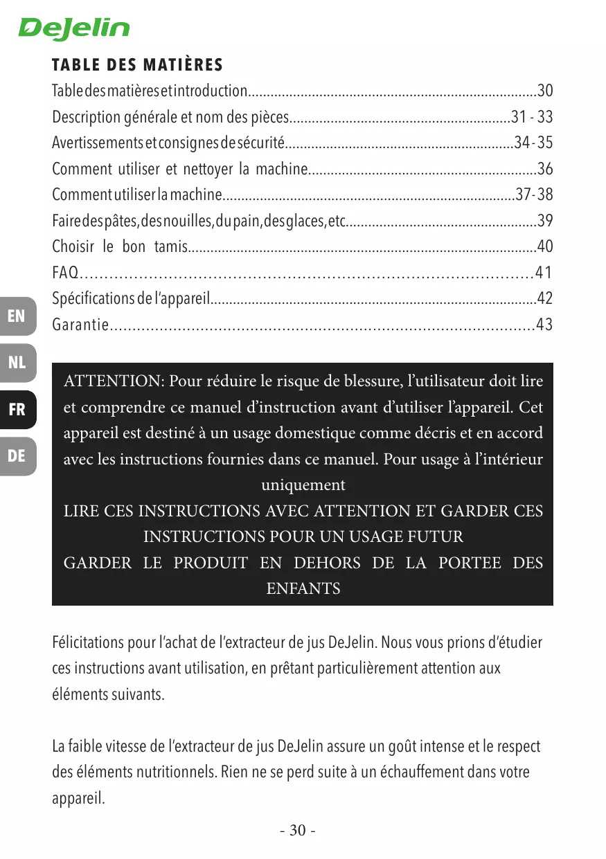Félicitations pour l'achat de l'extracteur de jus DeJelin. Nous vous prions d'étudier ces instructions avant utilisation, en prétant particulièrement attention aux éléments suivants.