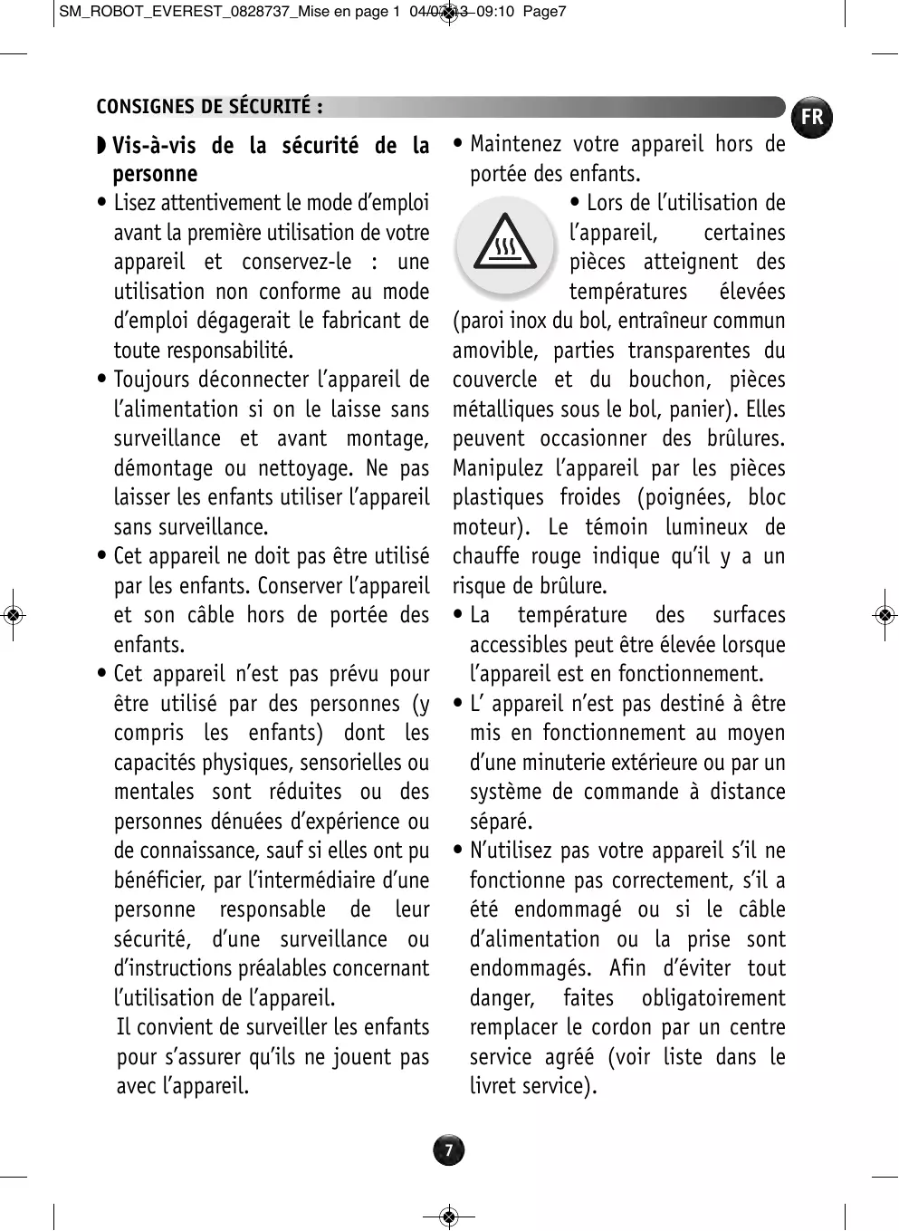 • Maintenez votre appareil hors de portée des enfants. • Lors de l’utilisation de l’appareil, certaines pièces atteignent des températures élevées (paroi inox du bol, entraîneur commun amovible, parties transparentes du couvercle et du bouchon, pièces métalliques sous le bol, panier). Elles peuvent occasionner des brûlures. Manipulez l’appareil par les pièces plastiques froides (poignées, bloc moteur). Le témoin lumineux de chauffe rouge indique qu’il y a un risque de brûlure. • La température des surfaces accessibles peut être élevée lorsque l’appareil est en fonctionnement. • L’ appareil n’est pas destiné à être mis en fonctionnement au moyen d’une minuterie extérieure ou par un système de commande à distance séparé. • N’utilisez pas votre appareil s’il ne fonctionne pas correctement, s’il a été endommagé ou si le câble d’alimentation ou la prise sont endommagés. Afin d’éviter tout danger, faites obligatoirement remplacer le cordon par un centre service agréé (voir liste dans le livret service). 7