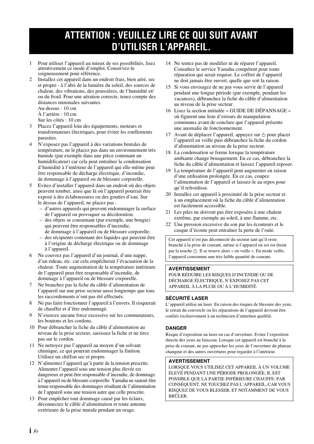Pour utiliser l’appareil au mieux de ses possibilités, lisez attentivement ce mode d’emploi. Conservez-le soigneusement pour référence. Installez cet appareil dans un endroit frais, bien aéré, sec et propre - à l’abri de la lumière du soleil, des sources de chaleur, des vibrations, des poussières, de l’humidité et/ ou du froid. Pour une aération correcte, tenez compte des distances minimales suivantes. Au-dessus : 10 cm À l’arrière : 10 cm Sur les côtés : 10 cm Placez l’appareil loin des équipements, moteurs et transformateurs électriques, pour éviter les ronflements parasites. N’exposez pas l’appareil à des variations brutales de température, ne le placez pas dans un environnement très humide (par exemple dans une pièce contenant un humidificateur) car cela peut entraîner la condensation d’humidité à l’intérieur de l’appareil qui elle-même peut être responsable de décharge électrique, d’incendie, de dommage à l’appareil ou de blessure corporelle. Evitez d’installer l’appareil dans un endroit où des objets peuvent tomber, ainsi que là où l’appareil pourrait être exposé à des éclaboussures ou des gouttes d’eau. Sur le dessus de l’appareil, ne placez pas : – d’autres appareils qui peuvent endommager la surface de l’appareil ou provoquer sa décoloration. – des objets se consumant (par exemple, une bougie) qui peuvent être responsables d’incendie, de dommage à l’appareil ou de blessure corporelle. – des récipients contenant des liquides qui peuvent être à l’origine de décharge électrique ou de dommage à l’appareil. Ne couvrez pas l’appareil d’un journal, d’une nappe, d’un rideau, etc. car cela empêcherait l’évacuation de la chaleur. Toute augmentation de la température intérieure de l’appareil peut être responsable d’incendie, de dommage à l’appareil ou de blessure corporelle. Ne branchez pas la fiche du câble d’alimentation de l’appareil sur une prise secteur aussi longtemps que tous les raccordements n’ont pas été effectués. Ne pas faire fonctionner l’appareil à l’envers. Il risquerait de chauffer et d’être endommagé. N’exercez aucune force excessive sur les commutateurs, les boutons et les cordons. Pour débrancher la fiche du câble d’alimentation au niveau de la prise secteur, saisissez la fiche et ne tirez pas sur le cordon. Ne nettoyez pas l’appareil au moyen d’un solvant chimique, ce qui pourrait endommager la finition. Utilisez un chiffon sec et propre. N’alimentez l’appareil qu’à partir de la tension prescrite. Alimenter l’appareil sous une tension plus élevée est dangereux et peut être responsable d’incendie, de dommage à l’appareil ou de blessure corporelle. Yamaha ne saurait être tenue responsable des dommages résultant de l’alimentation de l’appareil sous une tension autre que celle prescrite. Pour empêcher tout dommage causé par les éclairs, déconnectez le câble d’alimentation et toute antenne extérieure de la prise murale pendant un orage. i Fr 14 Ne tentez pas de modifier ni de réparer l’appareil. Consultez le service Yamaha compétent pour toute réparation qui serait requise. Le coffret de l’appareil ne doit jamais être ouvert, quelle que soit la raison. 15 Si vous envisagez de ne pas vous servir de l’appareil pendant une longue période (par exemple, pendant les vacances), débranchez la fiche du câble d’alimentation au niveau de la prise secteur. 16 Lisez la section intitulée « GUIDE DE DÉPANNAGE » où figurent une liste d’erreurs de manipulation communes avant de conclure que l’appareil présente une anomalie de fonctionnement. 17 Avant de déplacer l’appareil, appuyez sur pour placer l’appareil en veille puis débranchez la fiche du cordon d’alimentation au niveau de la prise secteur. 18 La condensation se forme lorsque la température ambiante change brusquement. En ce cas, débranchez la fiche du câble d’alimentation et laissez l’appareil reposer. 19 La température de l’appareil peut augmenter en raison d’une utilisation prolongée. En ce cas, coupez l’alimentation de l’appareil et laissez-le au repos pour qu’il refroidisse. 20 Installez cet appareil à proximité de la prise secteur et à un emplacement où la fiche du câble d’alimentation est facilement accessible. 21 Les piles ne doivent pas être exposées à une chaleur extrême, par exemple au soleil, à une flamme, etc. 22 Une pression excessive du son par les écouteurs et le casque d’écoute peut entraîner la perte de l’ouïe. Cet appareil n’est pas déconnecté du secteur tant qu’il reste branché à la prise de courant, même si l’appareil en soi est éteint par la touche . Il se trouve alors « en veille ». En mode veille, l’appareil consomme une très faible quantité de courant. AVERTISSEMENT POUR RÉDUIRE LES RISQUES D’INCENDIE OU DE DÉCHARGE ÉLECTRIQUE, N’EXPOSEZ PAS CET APPAREIL À LA PLUIE OU À L’HUMIDITÉ.