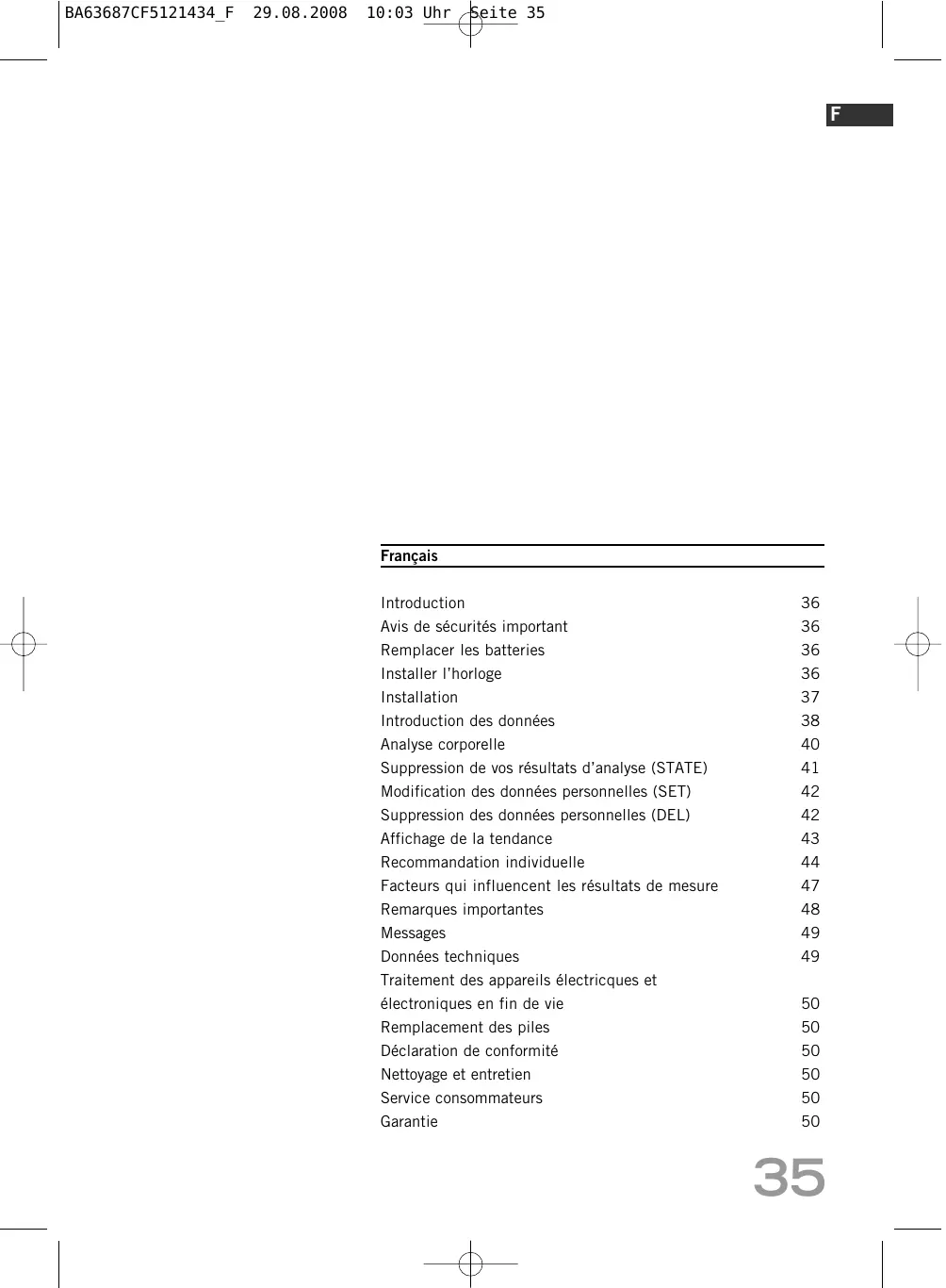Les décharges électroniques peuvent provoquer une interruption de la liaison radio du „Body Balance Comfort F5". Pour parer à ce problème, enlevez puis replacez la batterie.