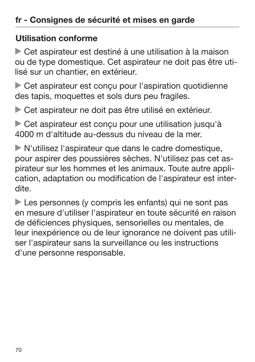 fr - Consignes de sécurité et mises en garde Utilisation conforme Cet aspirateur est destiné à une utilisation à la maison ou de type domestique. Cet aspirateur ne doit pas être utilisé sur un chantier, en extérieur. Cet aspirateur est conçu pour l'aspiration quotidienne des tapis, moquettes et sols durs peu fragiles. Cet aspirateur ne doit pas être utilisé en extérieur. Cet aspirateur est conçu pour une utilisation jusqu'à 4000 m d'altitude au-dessus du niveau de la mer. N'utilisez l'aspirateur que dans le cadre domestique, pour aspirer des poussières sèches. N'utilisez pas cet aspirateur sur les hommes et les animaux. Toute autre application, adaptation ou modification de l'aspirateur est interdite. Les personnes (y compris les enfants) qui ne sont pas en mesure d'utiliser l'aspirateur en toute sécurité en raison de déficiences physiques, sensorielles ou mentales, de leur inexpérience ou de leur ignorance ne doivent pas utiliser l'aspirateur sans la surveillance ou les instructions d'une personne responsable.
