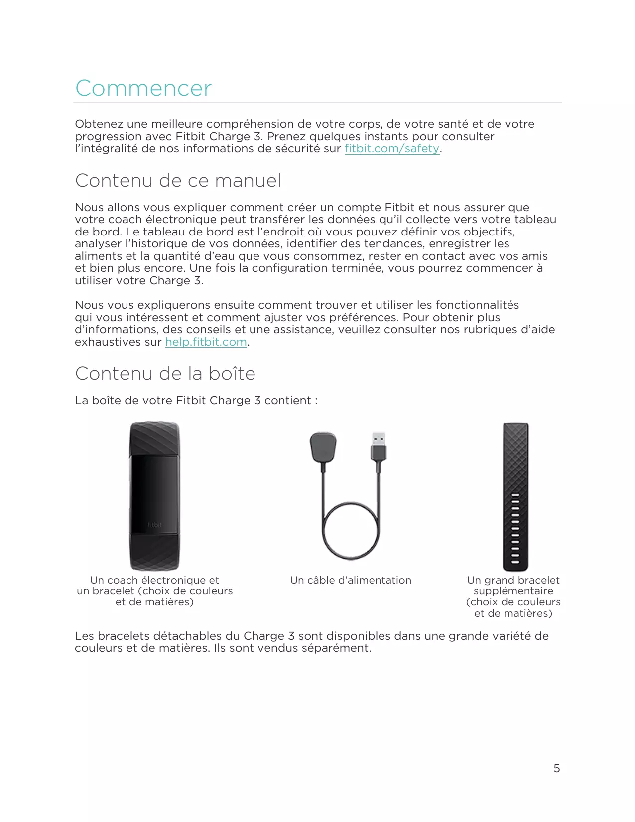Commencer Obtenez une meilleure compréhension de votre corps, de votre santé et de votre progression avec Fitbit Charge 3. Prenez quelques instants pour consulter l’intégralité de nos informations de sécurité sur fitbit.com/safety. Contenu de ce manuel Nous allons vous expliquer comment créer un compte Fitbit et nous assurer que votre coach électronique peut transférer les données qu’il collecte vers votre tableau de bord. Le tableau de bord est l’endroit où vous pouvez définir vos objectifs, analyser l’historique de vos données, identifier des tendances, enregistrer les aliments et la quantité d’eau que vous consommez, rester en contact avec vos amis et bien plus encore. Une fois la configuration terminée, vous pourrez commencer à utiliser votre Charge 3. Nous vous expliquerons ensuite comment trouver et utiliser les fonctionnalités qui vous intéressent et comment ajuster vos préférences. Pour obtenir plus d’informations, des conseils et une assistance, veuillez consulter nos rubriques d’aide exhaustives sur help.fitbit.com. Contenu de la boîte La boîte de votre Fitbit Charge 3 contient : Un coach électronique et un bracelet (choix de couleurs et de matières) Un câble d’alimentation Un grand bracelet supplémentaire (choix de couleurs et de matières) Les bracelets détachables du Charge 3 sont disponibles dans une grande variété de couleurs et de matières. Ils sont vendus séparément.
